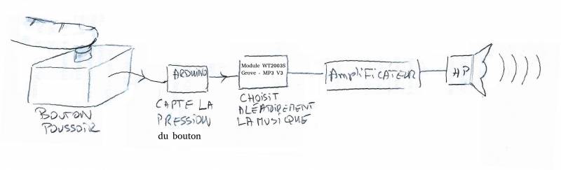 Lorsqu'on appuie sur un bouton poussoir connecté à l'entrée digitale d'une carte Arduino, elle sélectionne aléatoirement une musique et la joue tant que le doigt reste appuyé sur le bouton, via un module Grove MP3 V3.