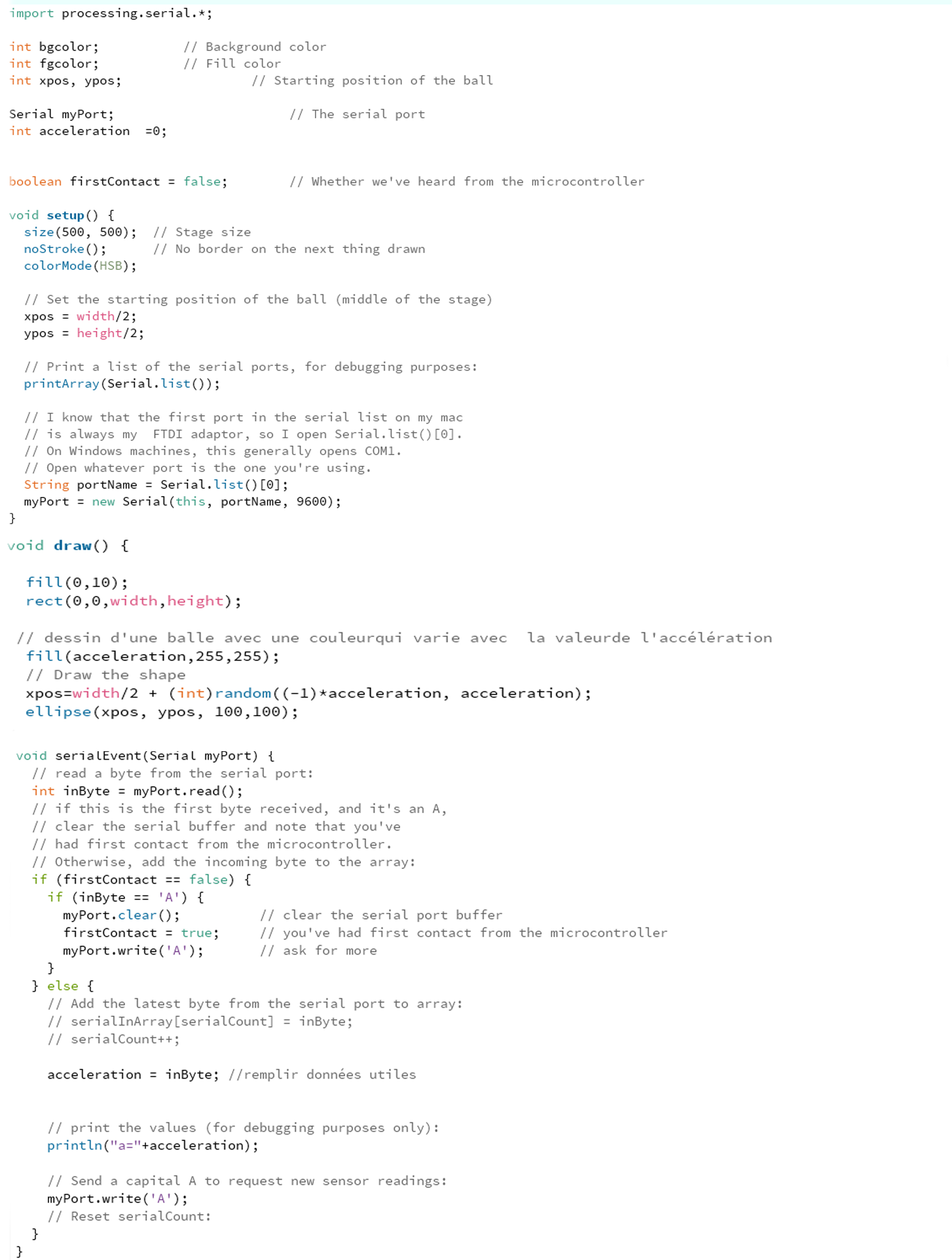 Programme Processing permettant de modifier la couleur d'une balle en fonction de l'accélération lue sur l'accéléormètre: