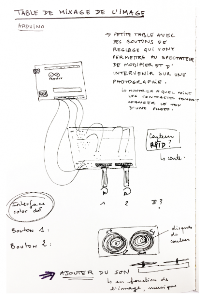 L'objectif est de construire une table de mixage avec des boutons qui permettent à l’observateur de faire des réglages sur l’image comme pourrait le faire un logiciel de retouche (photoshop). Ainsi, le spectateur peut se rendre compte que les réglages ont une incidence sur la perception et le sens de l’image. Chaque bouton permet de modifier les contrastes, les couleurs ou encore la luminosité…