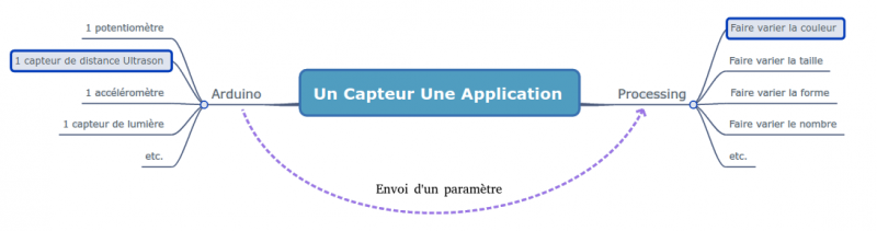 L'objectif de cet article est de montrer sur un exemple simple comment dialoguer entre la carte Arduino et Processing. L'objectif est de mesurer la valeur lue sur UN capteur et de l'envoyer vers le programme Processing comme un paramètre pouvant faire varier la forme ou la couleur d'un graphisme.