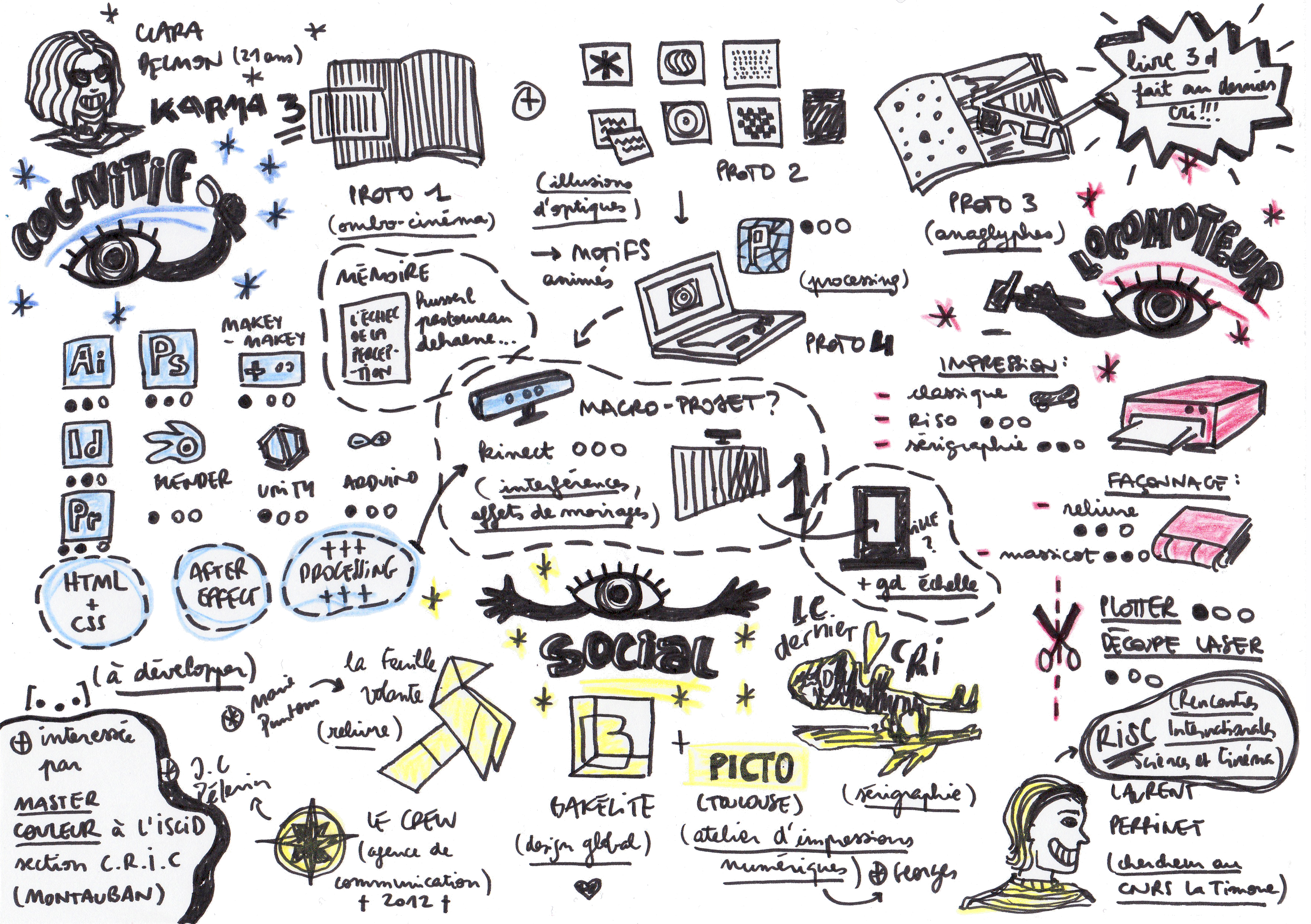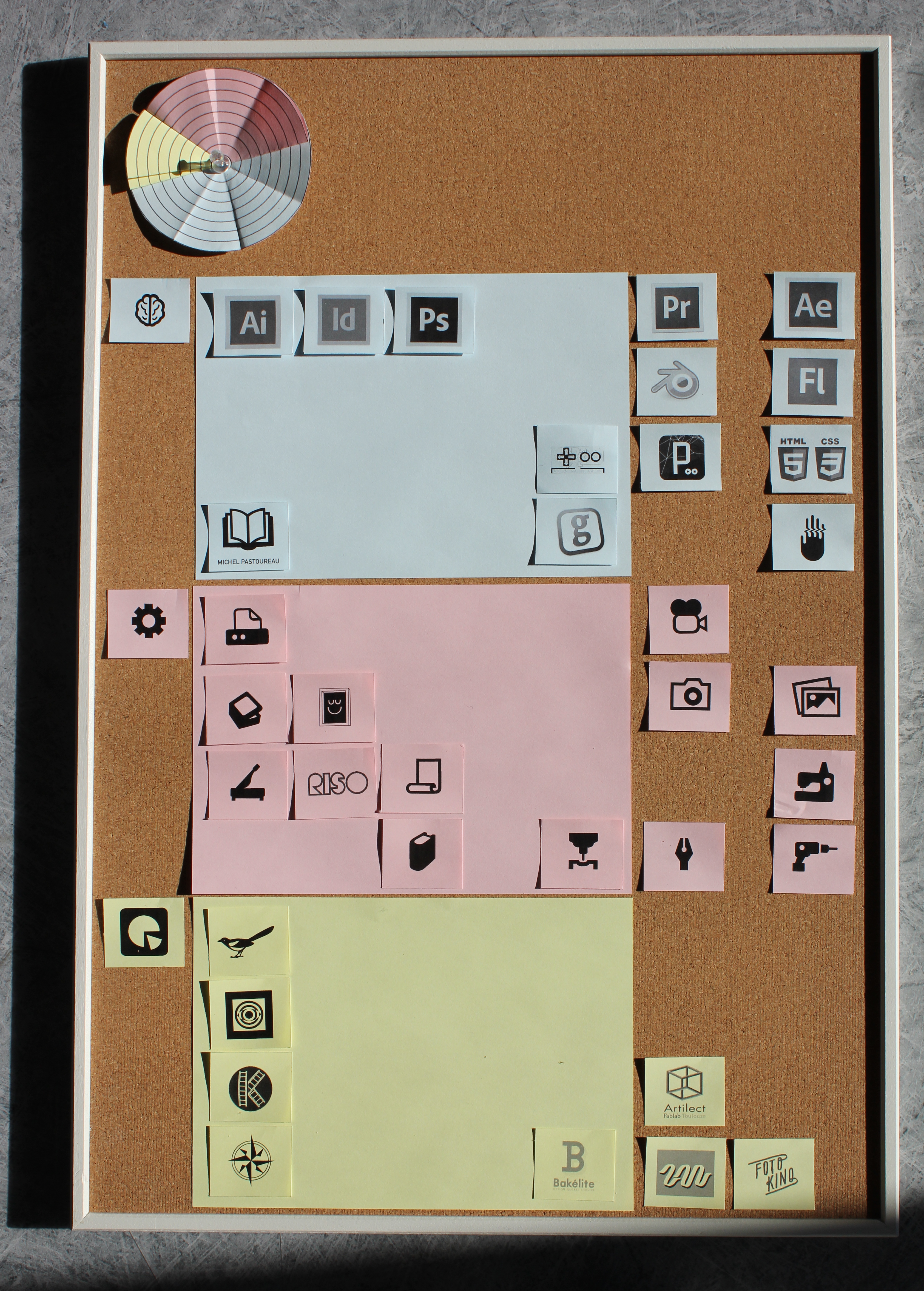 Distinction des 3 couches: cognitif, locomoteur, social par du papier de couleur. Icônes disposées sur le format A5= Acquis / Icônes détachées= envie d'apprendre ou de développer (les plus proches du A5 étant celles qui vont arrivées plus tôt ou qui ont déjà été abordées)