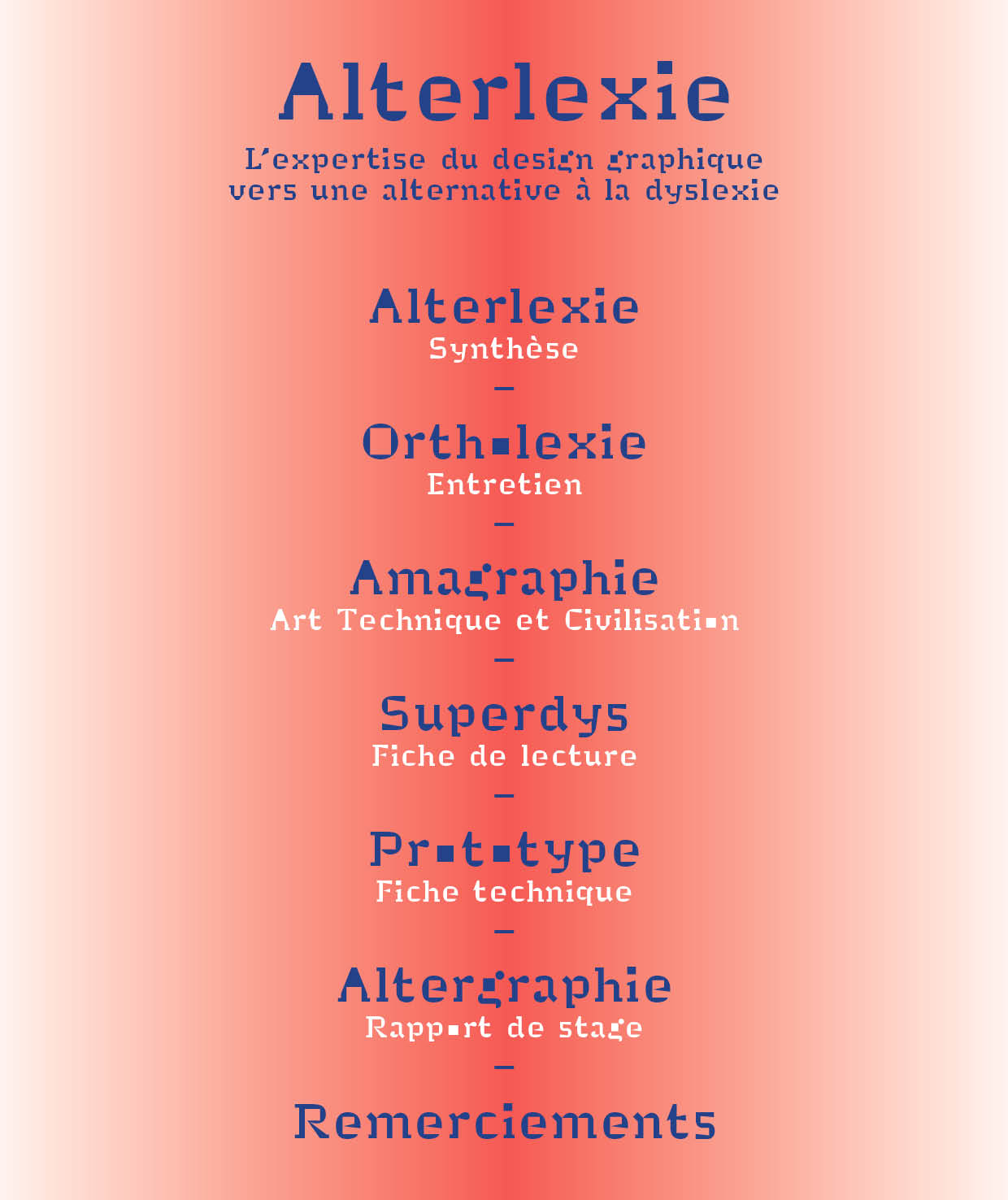 Mon objet d'étude porte donc sur l'expertise du design graphique vers une alternative à la dyslexie. Je souhaite questionner la norme et la manière dont le design graphique peut participer à une remédiation de la dyslexie en adaptant les outils graphiques à la singularité de la langue.