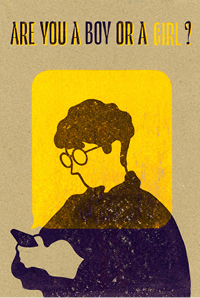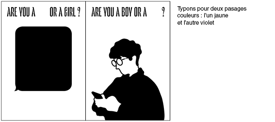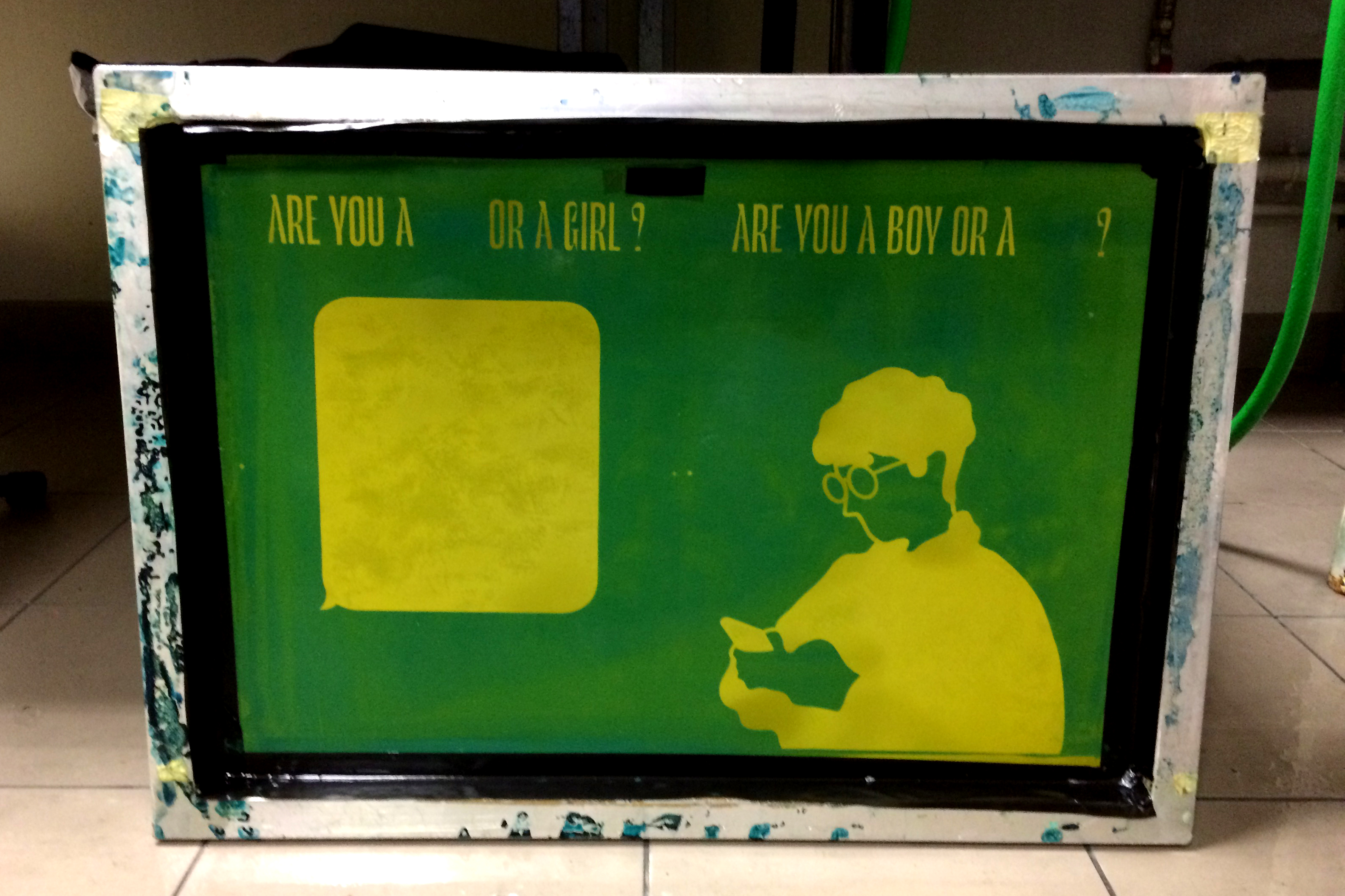 J'ai réalisé 5 affiches sérigraphiées sur des feuilles différentes (rose, jaune, papier journal imprimé, carton) en deux passages. En premier lieu, les deux typons format A3 m'ont servi à insoler mon cadre enduit. Puis j'ai réalisé un premier passage avec la partie droite du cadre et ensuite un deuxième avec la partie gauche. Enfin, la transparence des encres de sérigraphie m'a permis de faire apparaître les deux motifs de manière superposée (dans le titre je pouvais ainsi laisser boy et girl d'une seule couleur, contrairement au reste de la phrase).