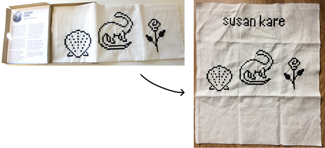 Pour le poster brodé de Susan Kare, je voulais révéler le cheminement dans le travail de Susan Kare par une version numérique. Ainsi, la broderie est entièrement réalisée à la main (fil + aiguille), grâce à la même technique utilisée auparavant par Susan Kare : le point compté (ou point de croix) sur une toile à broder. J'avais utilisé l'application HP Reveal pour détecter mes images brodées et afficher leur version pixelisée. Cependant, celle-ci est à présent obsolète, j'ai dû réfléchir à une autre solution pour afficher les animations à partir de la broderie. Ainsi par des QR codes brodés eux aussi sur la toile à broder, je renvoie au fichier animé déposé sur un drive (GoogleDrive) accessible à tous.