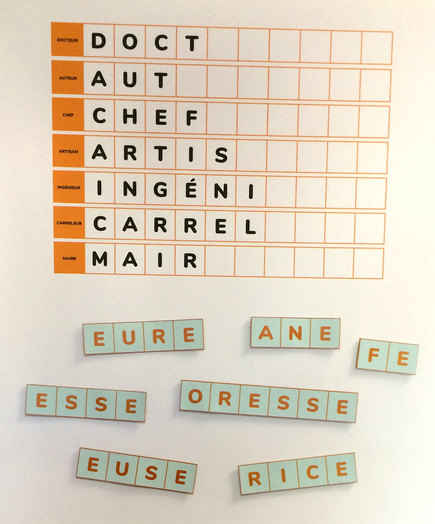 L'utilisateur peut alors placer l'infinitif qu'il lui semble le plus approprié. Dans cette version analogique, des magnets avec les différents infinitifs féminins possibles sont à placé sur l'espace aimanté au-dessus. On peut imaginer une évolution vers une version numérique, qui pourrait être mise en place grâce à Processing ou GDevelop. On utiliserait alors le principe de drag and drop pour placer les infinitifs où on le souhaite.