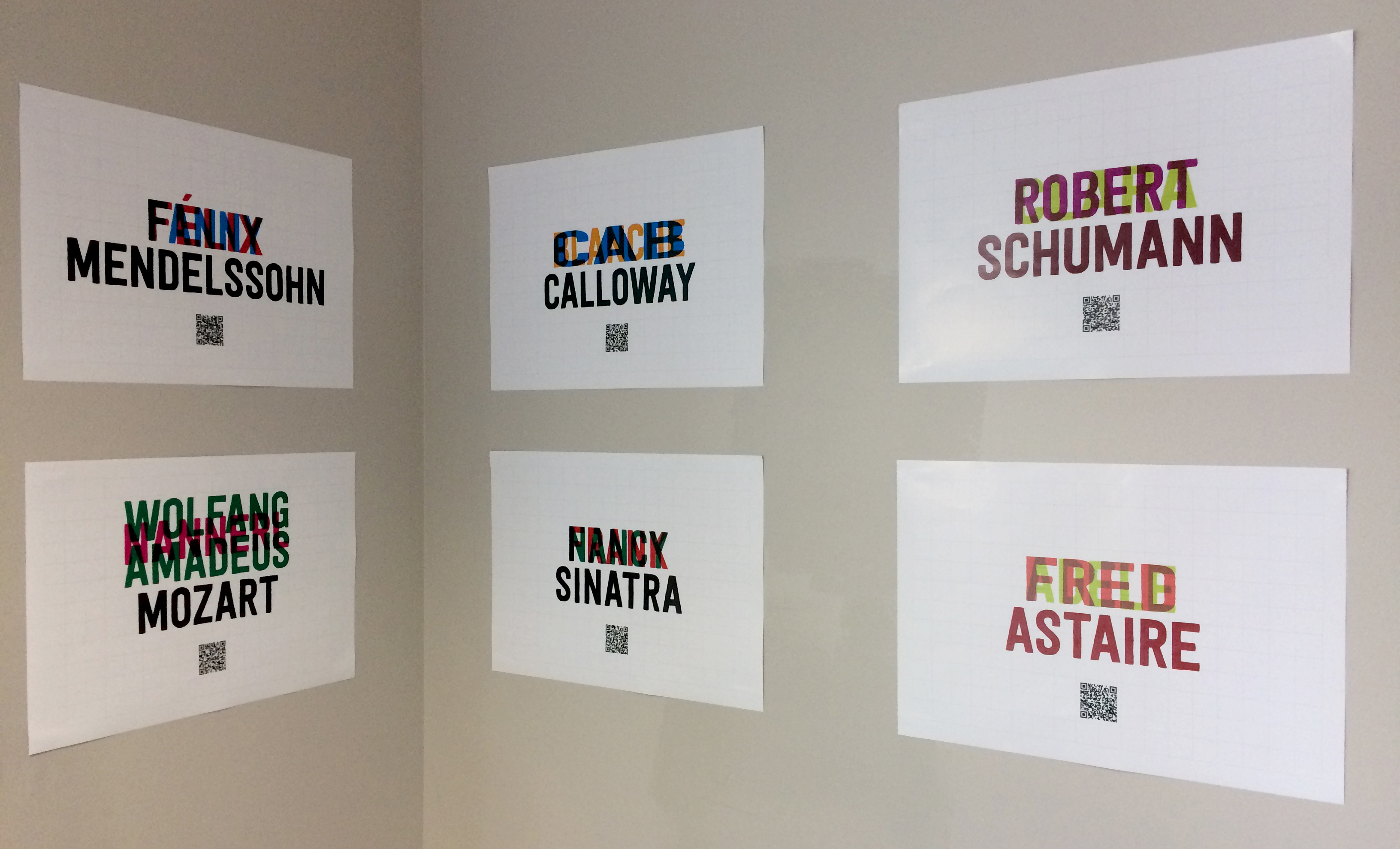 Cette série de posters, sur des artistes dans le domaine musical, présente par un jeu de superposition typographiques les nom de duos (père/fille, frère/sœur, mari/femme) dans lesquels le nom de la femme a systématiquement été effacé au profit de son pendant masculin. Les QR codes permettent de déjouer ce schéma répétitif en renvoyant directement à la musique de la personne de genre féminin du duo. Le lien présent reconduit l'utilisateur vers une page Spotify : on peut alors écouter la musique de l'artiste féminin, mais on obtient aussi des informations biographiques, sa vie, son œuvre.