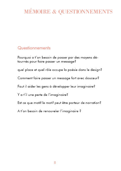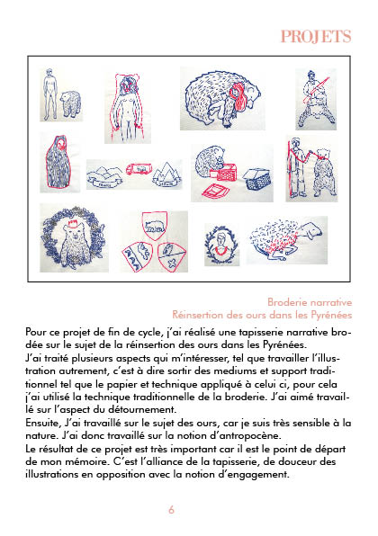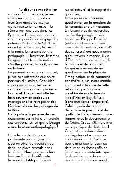 En analysant mon projet de fin de cycle universitaire, une tapisserie narrative, j’ai pu dégager des notions clés telles que le MEDUIM, qui est ici la broderie, le travail à la main, la transmission, la pédagogie, l’illustration, le temps, l’engagement (avec la notion d’anthropocène), la forêt, modes de lectures.
