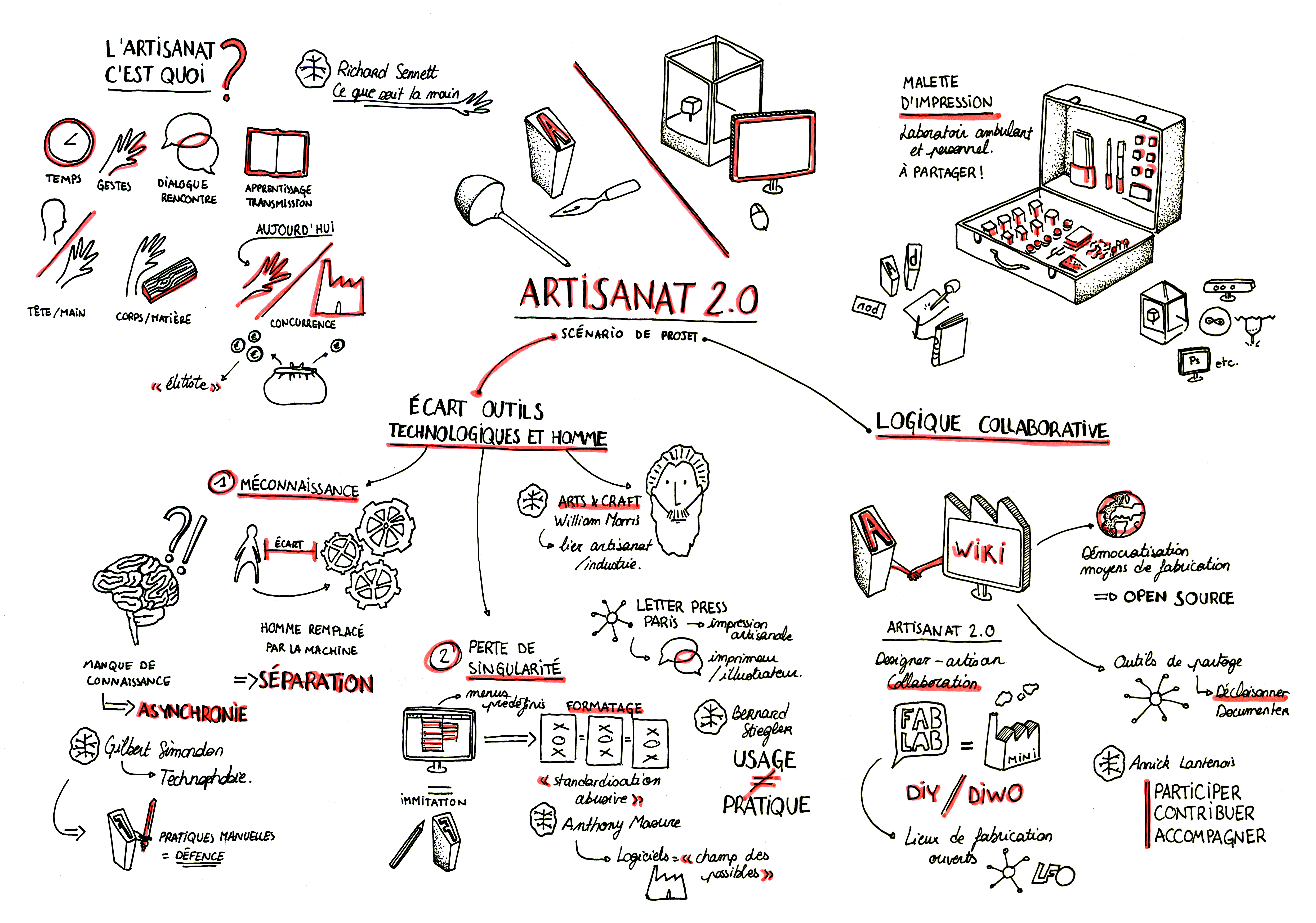 • Tout est parti d’une simple remarque : dans le graphisme actuel on trouve deux types de pratiques. La première tente de s’approprier les nouvelles technologies, tandis que la seconde se retourne vers les pratiques dites manuelles. Mais qui dit retour des outils physiques ne signifie pas forcément artisanat. La notion d’artisanat est un point de départ pour ce projet, il est important d’en donner une brève définition, qui sera approfondi plus tard, d’autant plus que l’artisanat actuel n’est plus le même que celui du Moyen-Âge. Bien sûr, il reste certains points communs majeurs tel que le rapport au temps, sans doute l’élément clef de l’artisanat, il est nécessaire aussi bien à l’apprentissage et à la transmission de savoir-faire, que dans la réalisation minutieuse d’objets. Le geste précis semble lui aussi s’être transmis à l’identique depuis plusieurs siècles, tout comme la relation respectueuse entre main et matière. Cependant, au XIXème siècle, l’artisanat a connu son plus grand bouleversement par la mise en concurrence avec l’industrie et la mécanisation qui tentent de s’accaparer le savoir-faire de l’artisan pour ne plus dépendre de lui. Pour le dépasser, l’industrie cherche à travailler vite et en série pour faire du profit avec des prix moins élevés. Elle s’inscrit surtout dans la démarche capitalisme d’augmenter la productivité en mettant en place des principes comme la division des tâches et en confiant la fabrication à des dispositifs techniques dont le rythme de travail est infatigable contrairement à celui de l’homme. C’est dans ce contexte que le design intervient comme valeur ajoutée à ces produits qui peuvent paraître parfois de moins bonne qualité, et ainsi valoriser l’industrie. L’artisanat se retrouve considéré comme fabriquant des produits élitistes dans une société où l’on cherche constamment le moins cher. Avec l’automatisation, la reconnaissance d’un travail aussi intellectuel que manuel se fait beaucoup moins facilement. La prolétarisation entraine une dépossession de son travail, des savoirs dans la production et surtout de soi. Le sociologue américain Richard Sennett défend cette notion de la tête indissociable de la main, l’artisan n’est pas que fabriquant, il est aussi concepteur. Il ne travaille pas seul mais en communauté, un moyen d’échanger et de collaborer sur des savoirs.