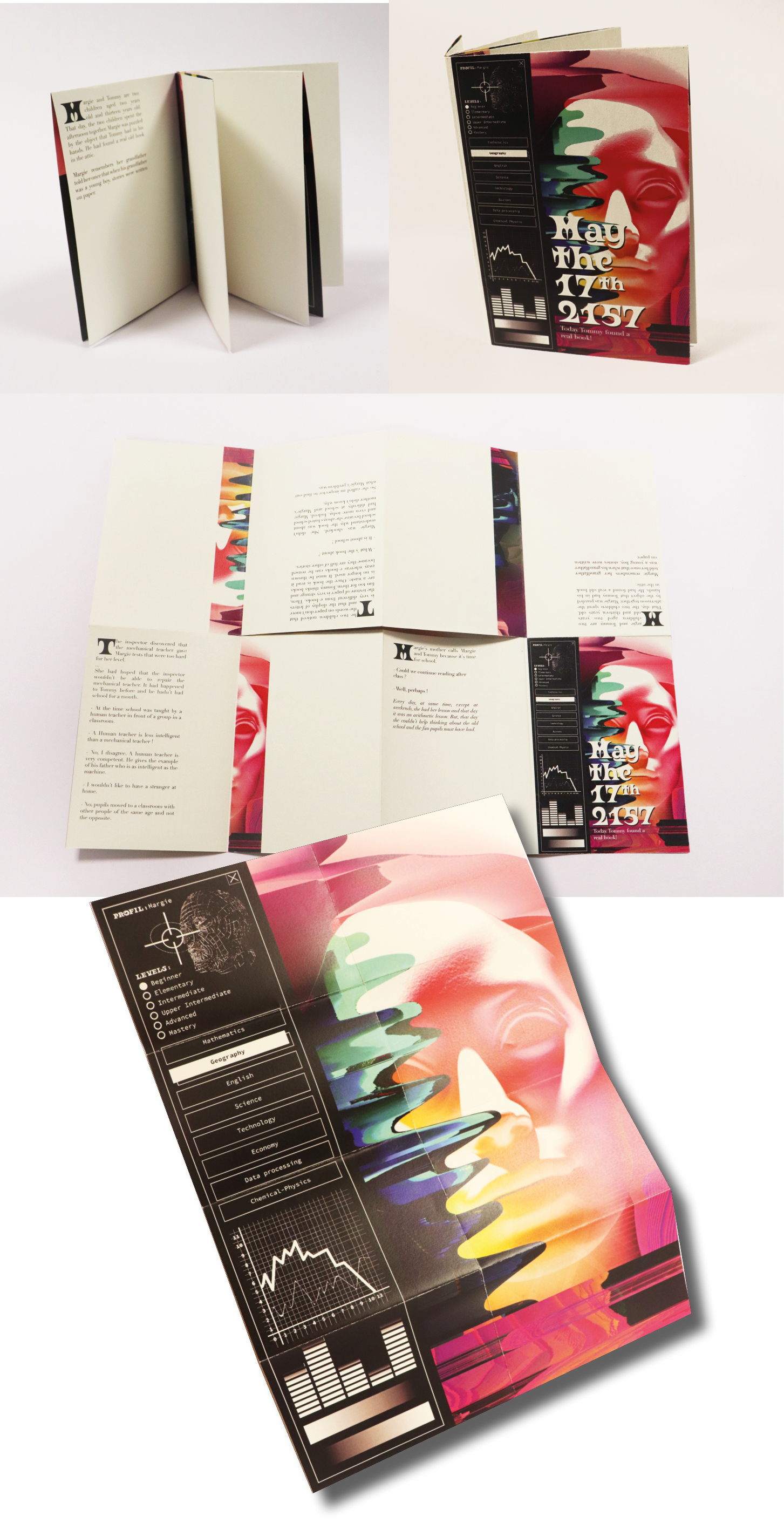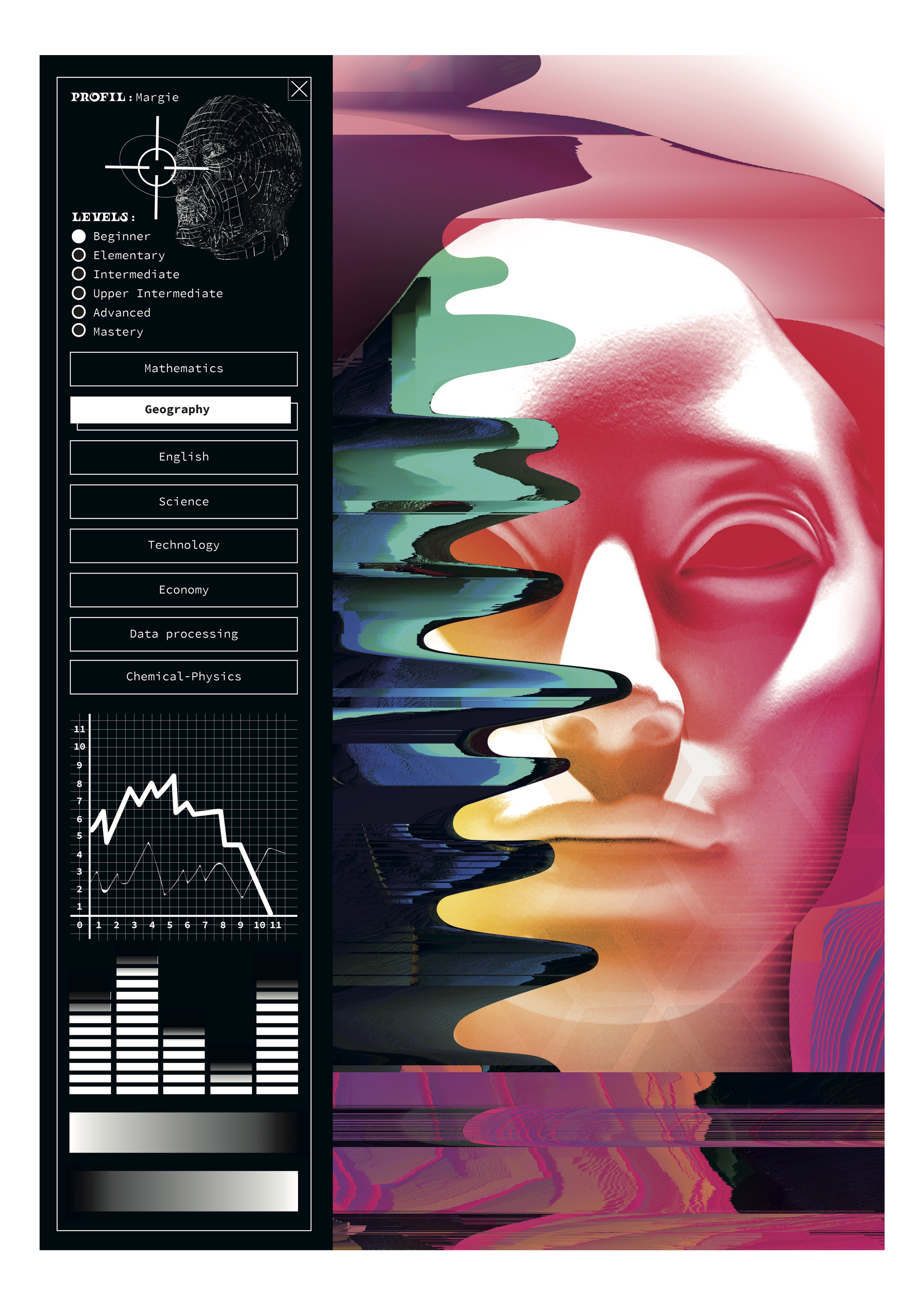 Pour réaliser se projet j'ai choisie d'illustrer le portrait et la vision du professeur robot sur la jeune fille “Margie”. À gauche la fiche technique de l'élève avec ses statistiques croissants dans les différentes matières et à droite la représentation du professeur et la fragilité d'une telle éducation.