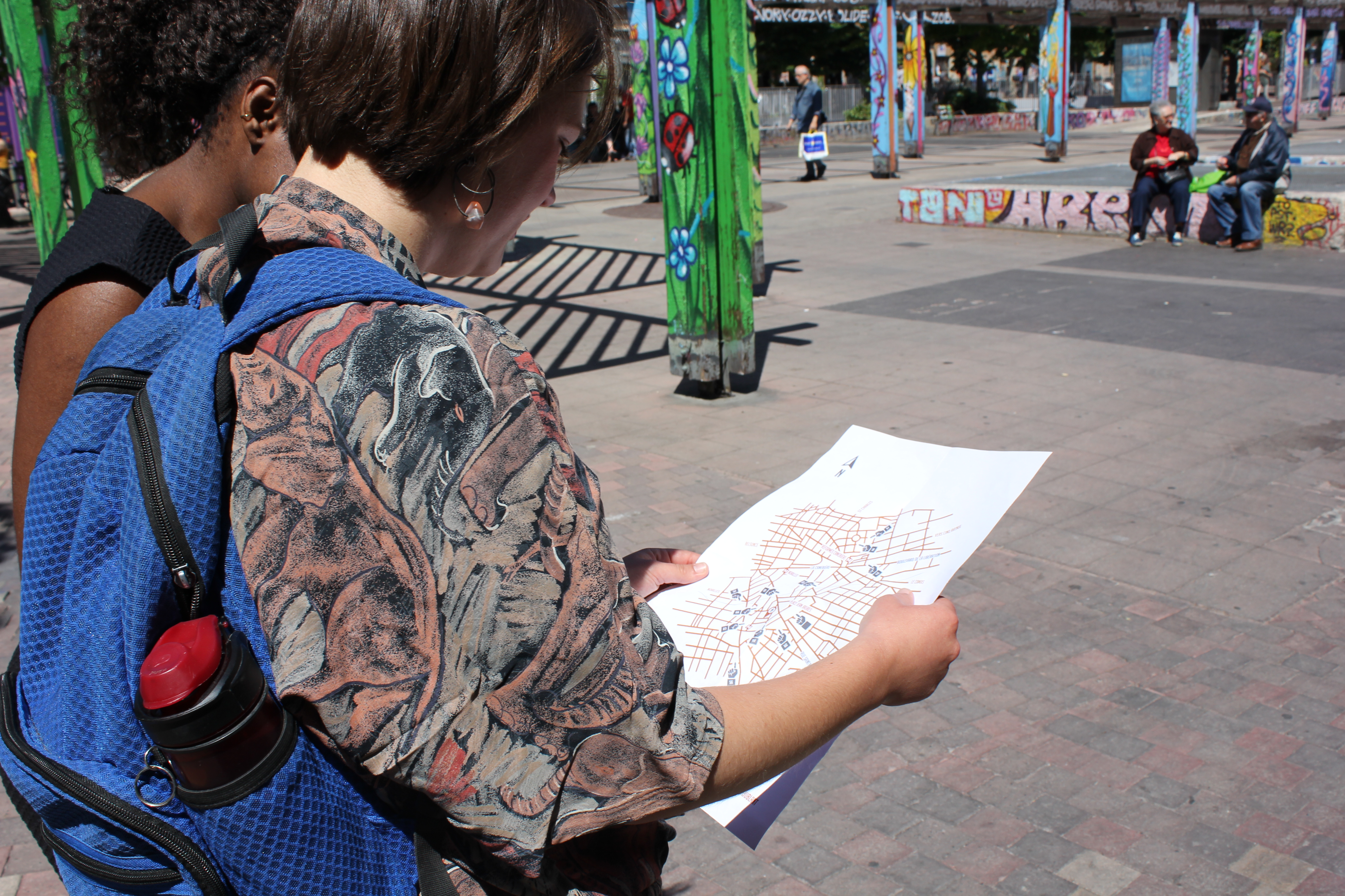 Dans sa dernière version, l’atelier se composait donc de deux parties. Dans un premier temps, les participants s’adonnent à un jeu de piste par équipe où le but est de trouver différentes balises dans un territoires donné à l’aide d’un plan. Chaque balise est une affiche contenant un coupons qui doit y etre prélevé et qui donnera après coup, une fois qu’il me sera rapporté, accès à un outil du kit dans la seconde partie de l’atelier. Ces balises sont placés dans des lieux stratégiques que je veux leur faire découvrir. L’idée est d’explorer de petites rues, des impasses, de sortir des sentiers battus, des chemins qu’ils emprunte habituellement. En les confontants ainsi à la ville, j’espère soulever des thématiques qui serait réinvesti dans la deuxième phase.