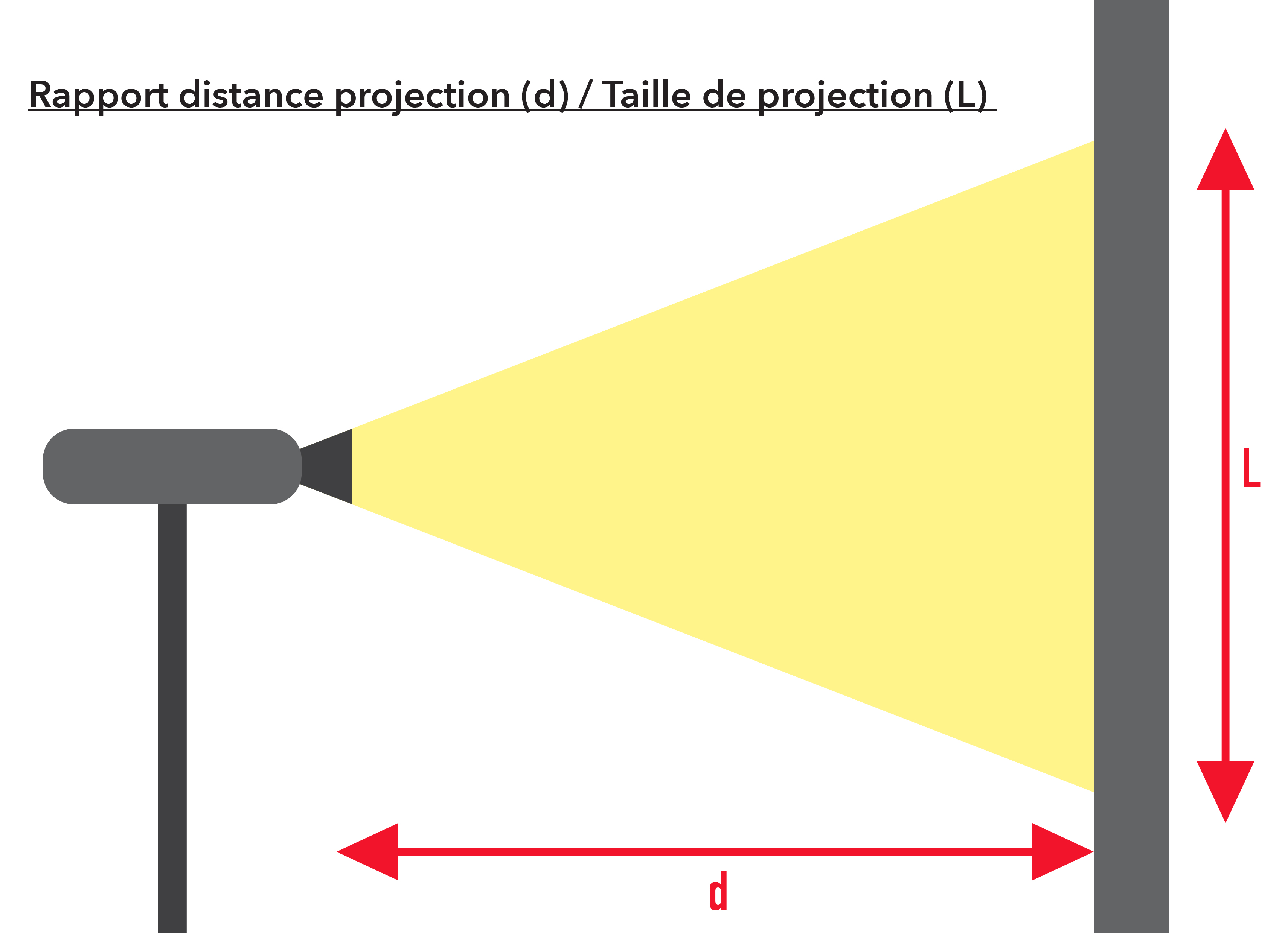 Devant le manque de hauteur sous plafond pour obtenir une projection assez grande, j'ai recherché une solution pour agrandir cette image. Il est possible de gagner une distance de projection (d) à l'aide d'un miroir afin d'agrandir la longueur de la projection (L). J'ai réalisé un certains nombre de relevé à partir du projecteur qui était à ma disposition grâce auxquelles j'ai pu réaliser une courbe et ainsi pu retrouver les valeurs idéales pour avoir la projection au sol à la bonne taille.