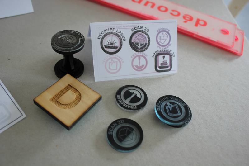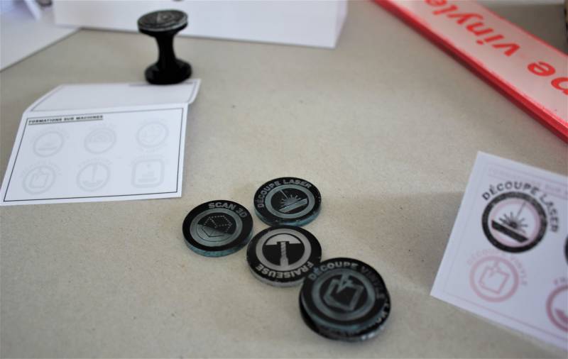 Deux boîtes (dont une réalisée aujourd'hui), l'une comportant tous les différents tampons qui correspondent à des compétences, l'autre à des formations à suivre proposées par la FabLab. Ainsi, chaque adhérent détient une carte/passeport personnel dans lequel des tampons figureront afin d'identifier leurs connaissances, leurs compétences et leur autonomie sur les machines.