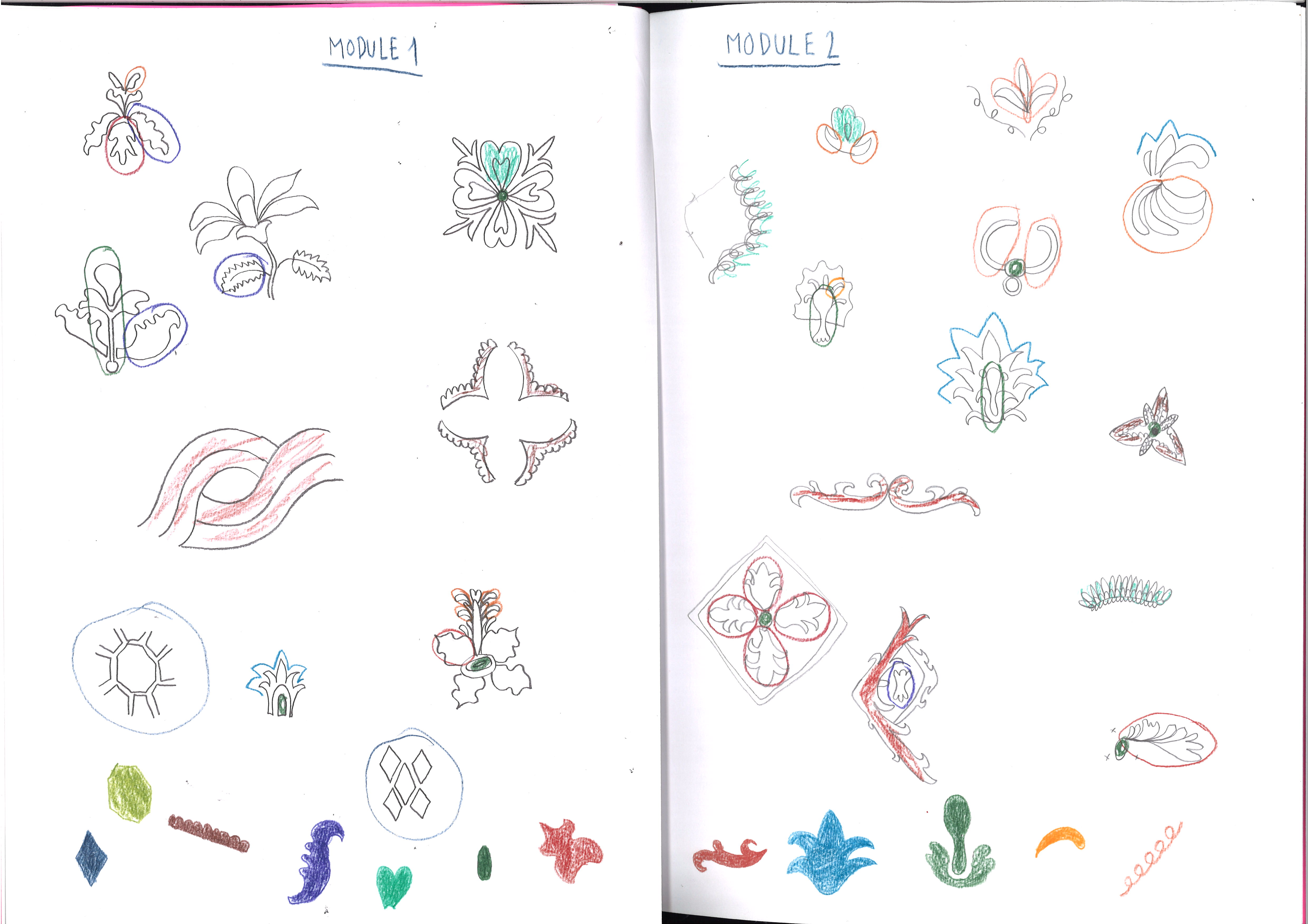Le caractère à été créé à partir de module prélevés sur les motifs du musée Borely. Ils sont ensuite ré-agencés pour en faire un caractère à part entière. Ce caractère va me permettre de générer des textes critiquant l'ornement. Ainsi, on se retrouve avec une typographie non lisible mais déchiffrable.