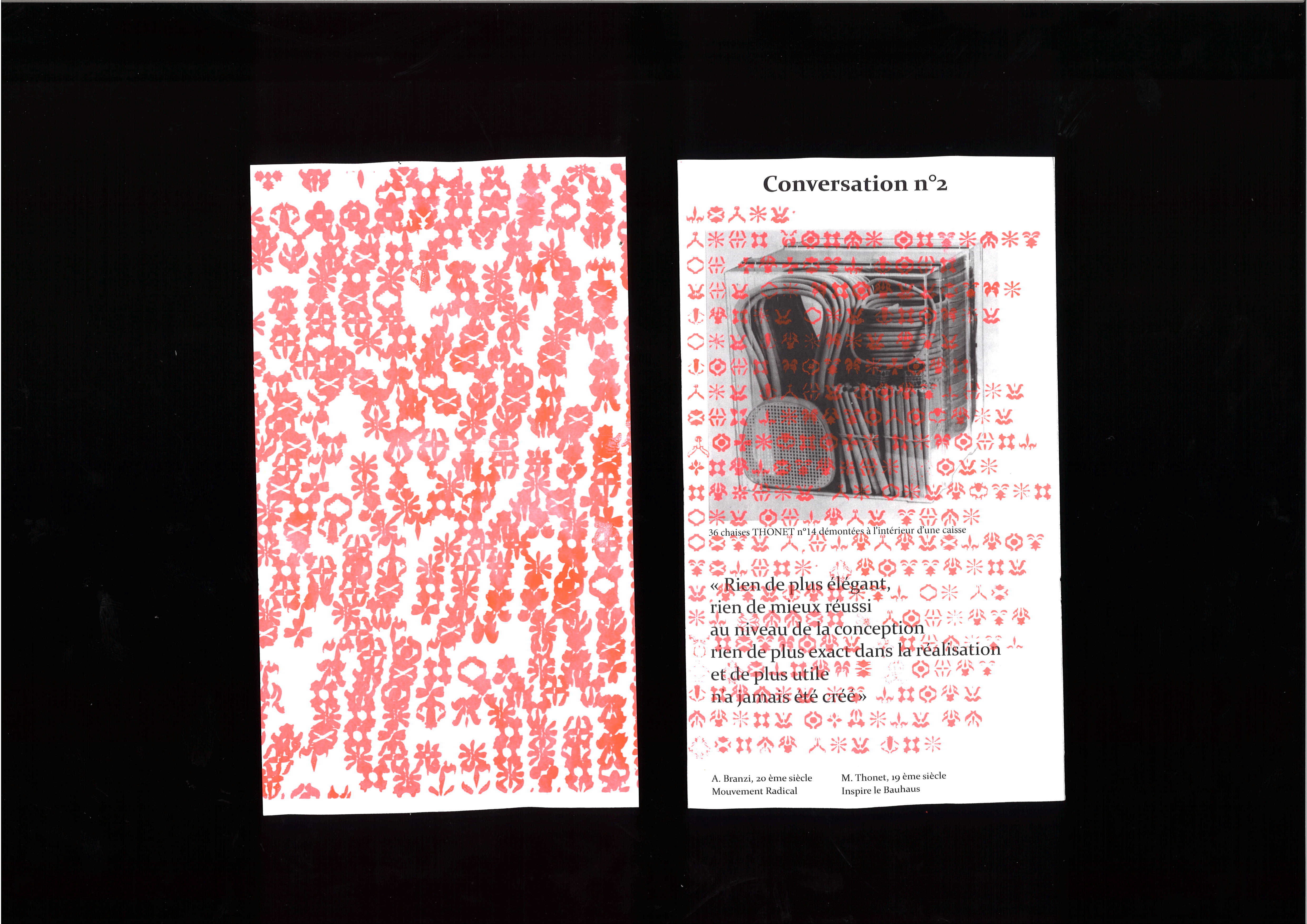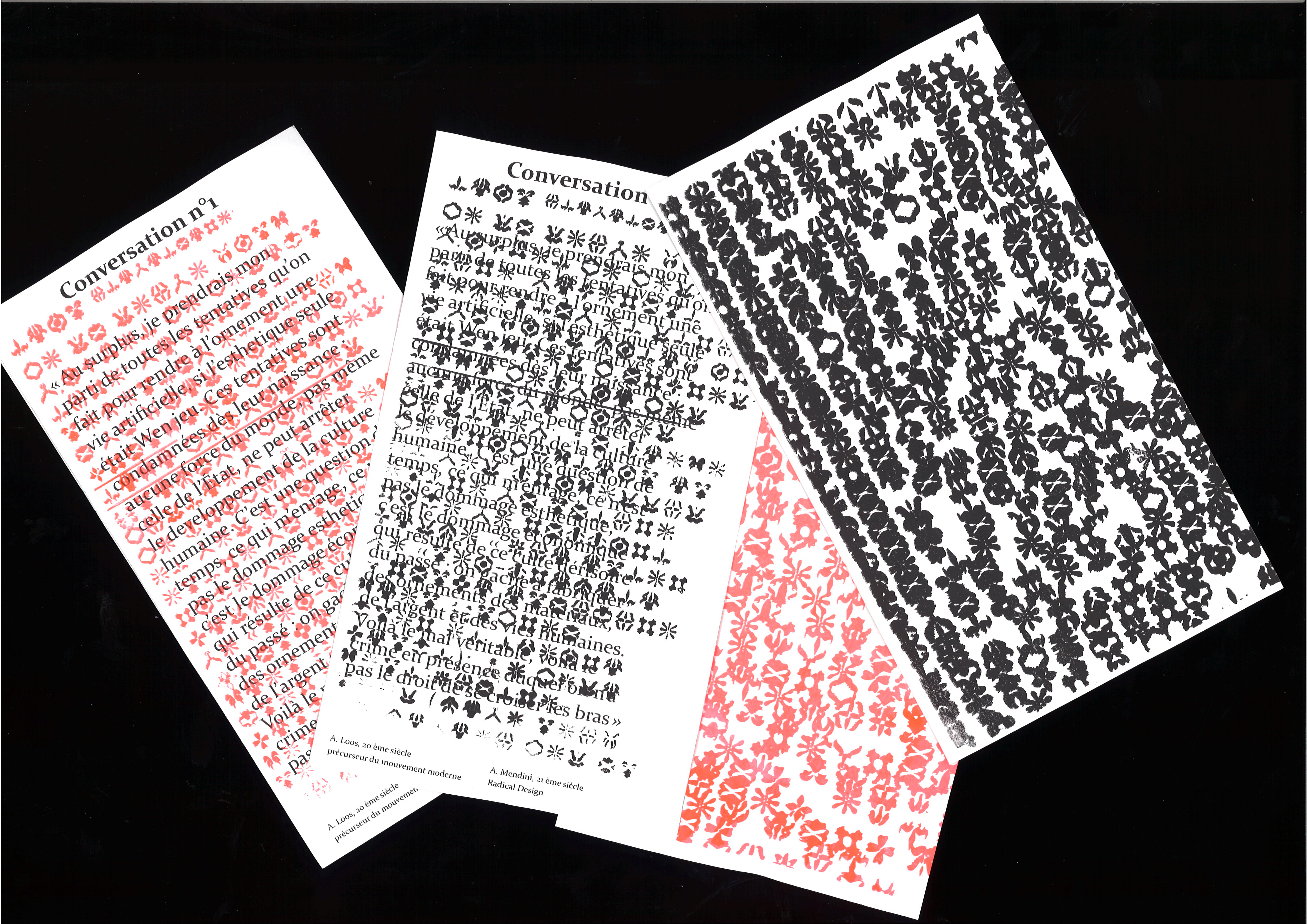 * Des textes sérigraphiés venant recouvrir les arguments “pro-ornement” dans le caractère non lisible créé grâce à Calligraphr.