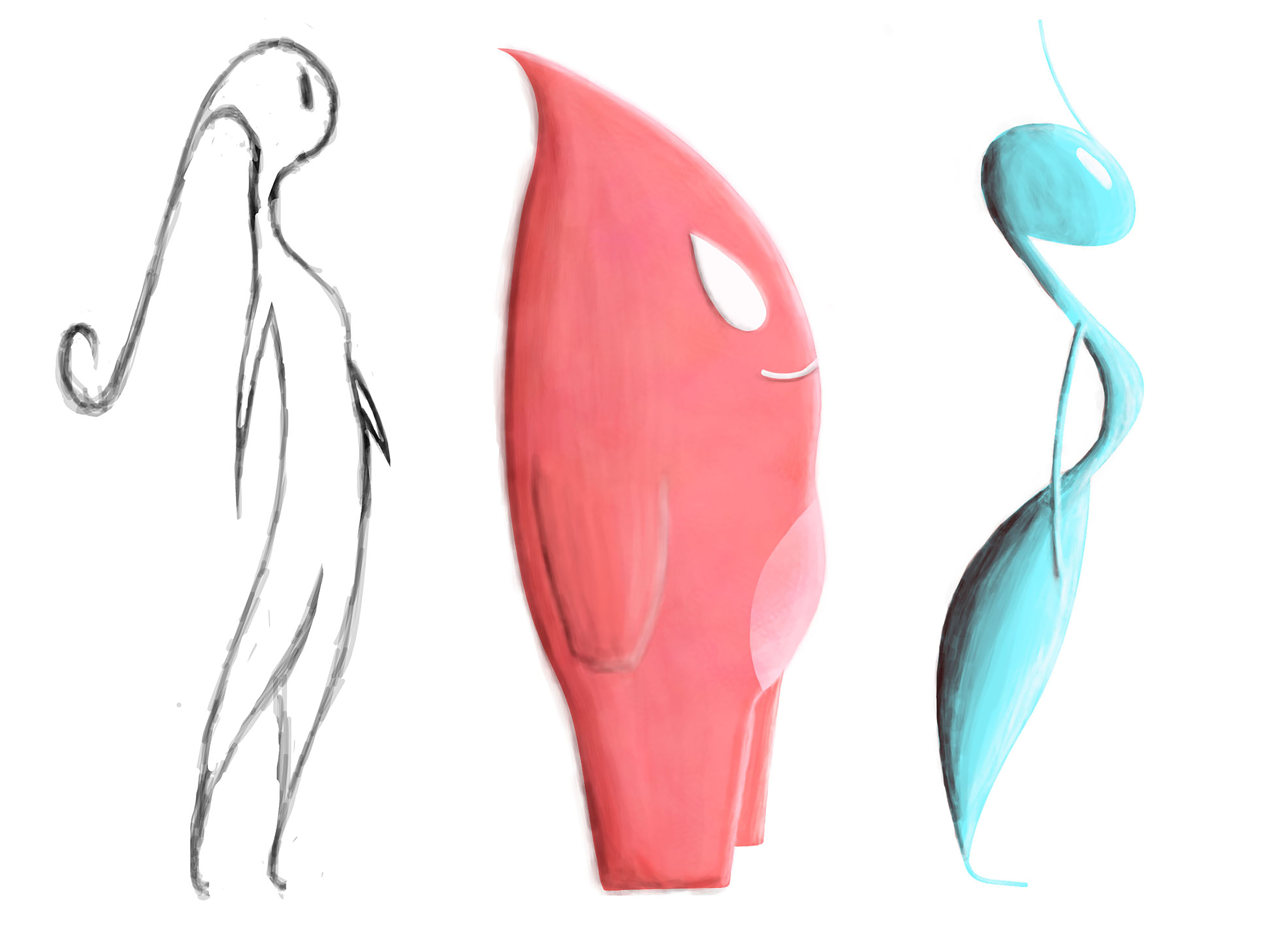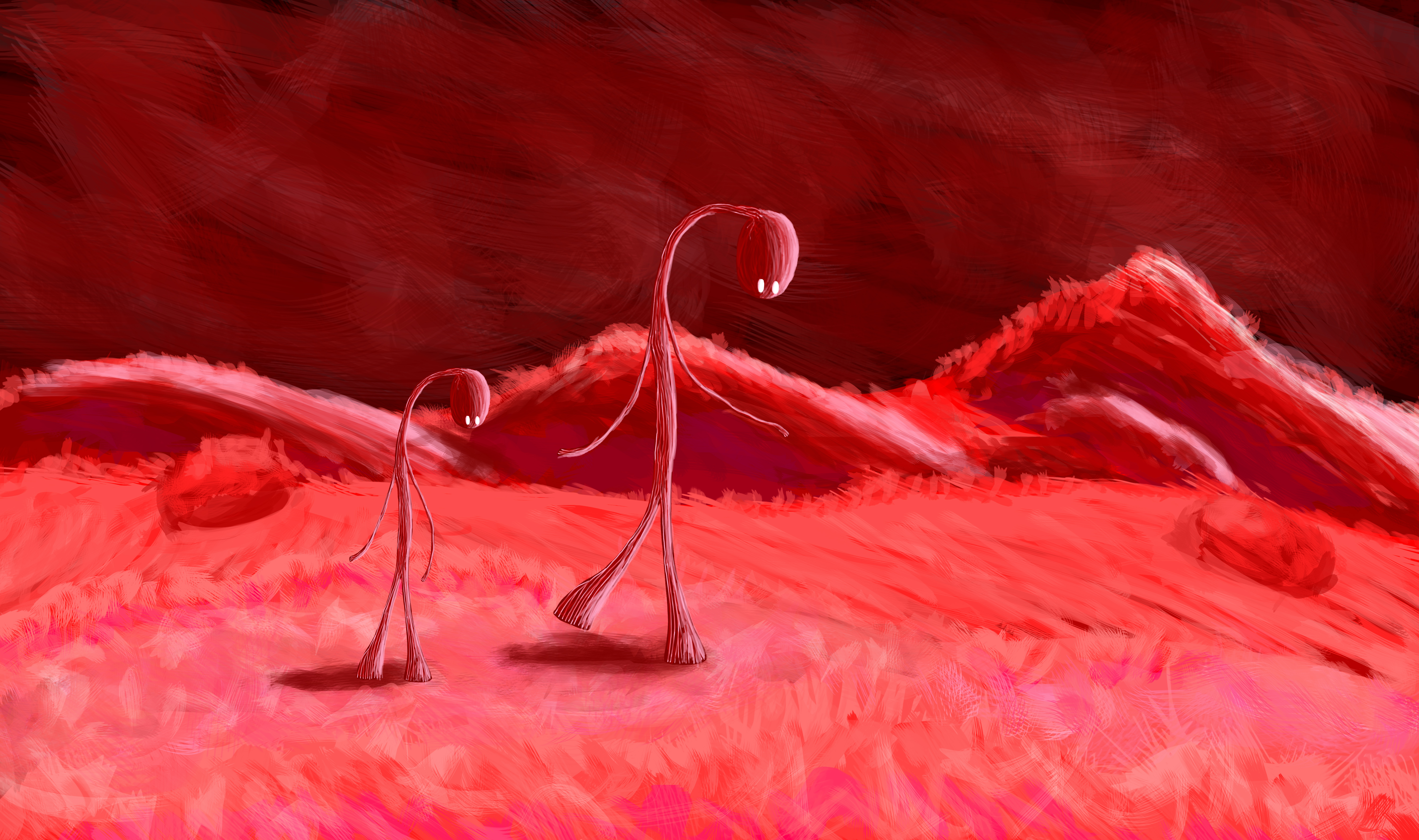 Du point de vue graphique, le choix d’un univers totalement détaché de la réalité me donne un moyen plus efficace de permettre aux joueurs de rêver, de s’abandonner au travers du jeu-vidéo. Ici, les couleurs se situent dans un camaïeu rouge pour donner un aspect sanguin à l’univers. Lorsque le corps devient numérique, les couleurs se tournent vers des nuances de gris et le paysage devient une grille électronique. Concernant les personnages principaux, j’aimerai qu’ils soient complémentaires, c’est-à-dire qu’ils soient très différents que ce soit par la couleur ou la forme, mais qu’ils s’accordent finalement l’un à l’autre à la manière du yin et du yang. D’autres personnages seront présents dans le décor sous forme de créatures amicales vivant dans le corps.