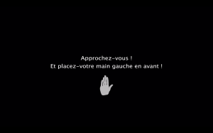 Par rapport au spectateur, il n’y a pas d’incompréhension par rapport à ce qu’il voit, ce qui lui permet de se projeter dans l’image. Ici l’interaction a lieu entre la machine et l’utilisateur bien qu’il n’y ait aucune instruction ou aide. Jouer simplement sur la curiosité du spectateur suffit à l’emploi du dispositif. Cependant les problèmes viennent de l’image numérique proposée. Elle manque de précision au niveau de la formation de la silhouette. Il faudrait qu’elle soit plus lisse, plus définie pour avoir une meilleure reconnaissance.
