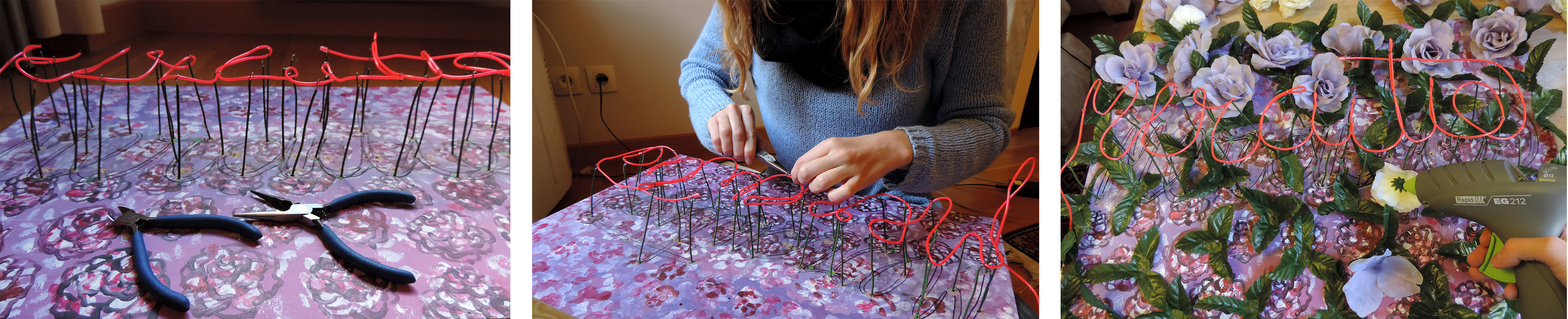 Dans ce sujet de la déclaration d’amour, j’ai choisis de traiter de déclarations d’amour différentes de celle que l’on s’imagine à première vue : le sacrifice et l’hommage. Le sacrifice est un don de soi, un don de sa vie par amour et donc peut être considéré comme une déclaration d’amour. Quant à l’hommage, il exprime du respect, de l’admiration et de la reconnaissance pour quelqu’un. C’est un témoignage d’amour. Mercutio est mort pour Romeo, il l’a défendu lors de la bagarre, il s’est battu à sa place, donc on peut donc dire qu’il s’est sacrifié. Et moi, en réalisant ce projet, je rends hommage à Mercutio. En effet, le fait simplement d’écrire le nom d’une personne dans un lieu est perçu comme une preuve d’amour, de reconnaissance, par exemple le nom de son/sa bien aimé gravé sur un arbre ou encore le nom d’une personne disparue inscrit en doré sur sa pierre tombale. Le fond de fleurs artificielles rappelle également le cimetière, mais elles ont été choisies aussi pour apporter un aspect kitsch au projet. Puisque le sujet de la déclaration d’amour est un sujet plutôt kitsch, j’ai voulu faire une réponse kitsch. Le néon aussi participe à cet aspect rétro de mauvais goût et participe également à la notion d’hommage puisqu’il met en lumière le nom de Mercutio. Le néon possède une symbolique du temps et de la mort. En 2011, Douglas Gordon a écrit : « Every time you switch me off, we die a little. » (A chaque fois que vous m’éteignez, nous mourrons un peu), en 2010, le néon de Stefan Brüggemann nous dit : « This work should be turn off when I die. » (Cette œuvre devra être éteinte à ma mort).