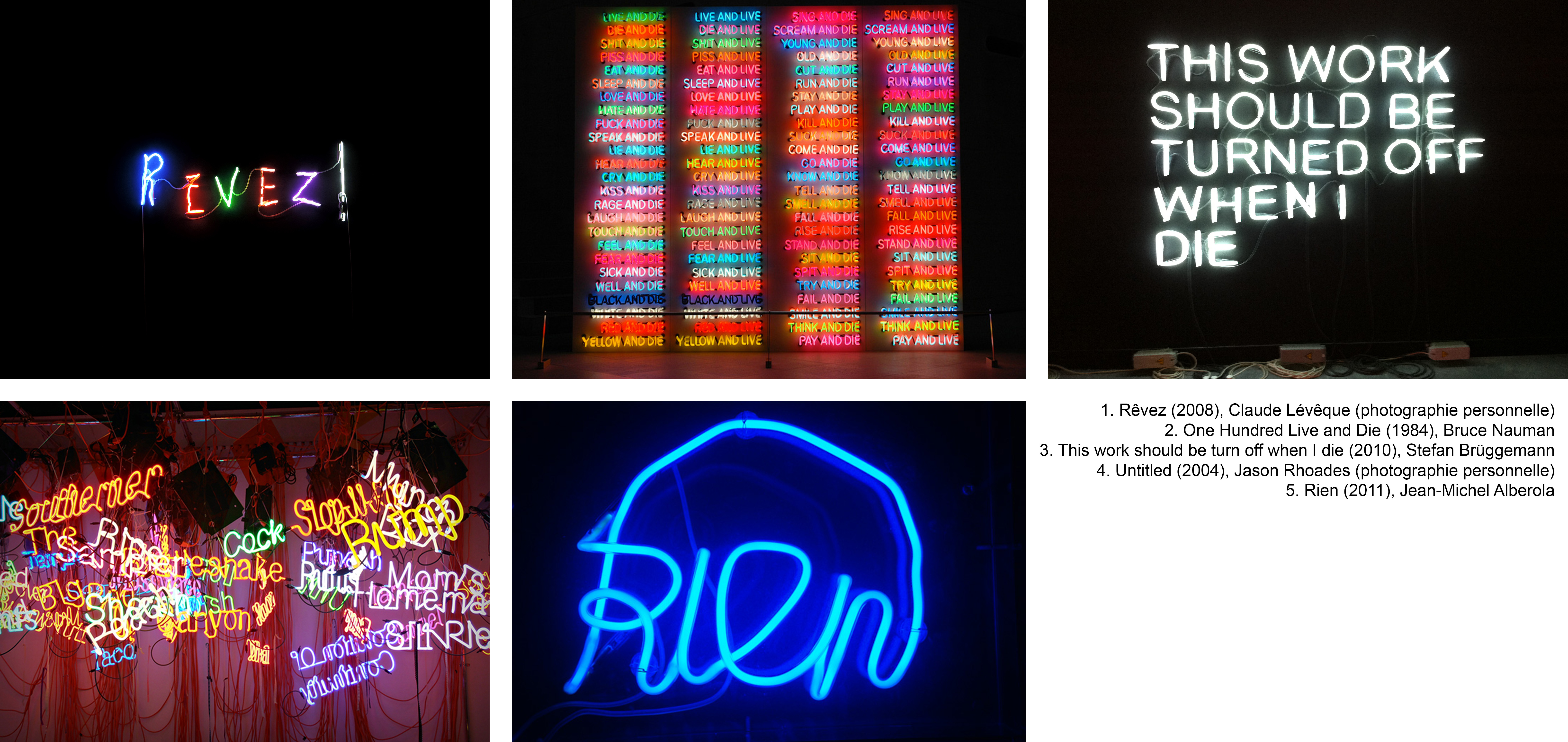 Dans ce projet, j’ai voulu utiliser le néon car j’ai adoré l’exposition Neon, who’s afraid of red, yellow and blue ? à la Maison rouge de Paris en 2012. Cette exposition fût la première dans le monde à être consacrée entièrement aux néons des années 1940 à 2012. J’ai pu découvrir les œuvres des pionniers Gyula Kosice et Lucio Fontana au début des années 1940 à 50, celles de François Morellet, Bruce Nauman, Stephen Antonakos, Joseph Kosuth ou Mario Merz dans les années 60 et celles des artistes d’aujourd’hui comme Jason Rhoades, Claude Lévêque, Sylvie Fleury, Alfredo Jaar et tant d’autres. Le néon est pour moi un matériau magique qui disparait une fois l’alimentation coupée. Qu’il possède des courbes ou qu’il soit droit et très géométrique, je trouve qu’il dégage beaucoup de poésie. En effet, le contraste des couleurs et des lumières me fascine.