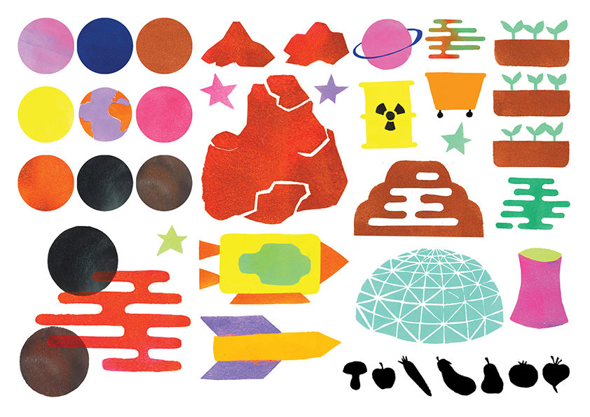 Face aux nombreux problèmes écologiques, pourquoi ne pas tout délocaliser dans l’espace ? Une question que se pose aussi de nombreux scientifiques, dont la NASA, et qui donne le point de départ à ce projet. Des idées d’abord illustrées sous forme de pop up, grâce à des disques à tourner et des languettes à tirer, pour permettre au spectateur de plonger dans cette utopie spatiale un peu naïve et onirique.