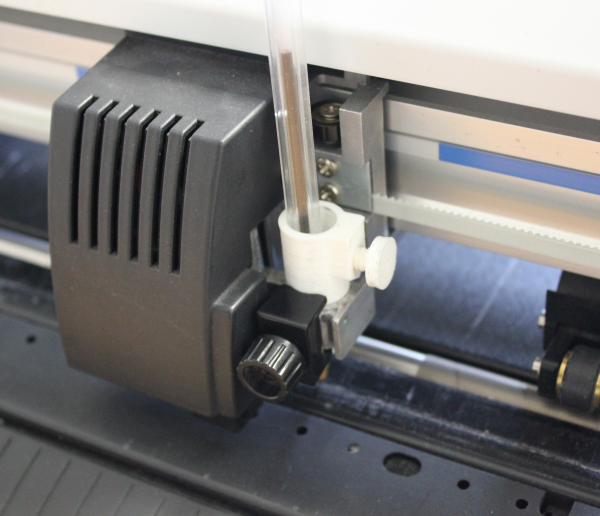 J'ai détourné sa fonction initiale de découpe en fonction de traçage. Pour cela, j'ai imprimé un adaptateur en 3D (avec une Ultimaker 2) permettant d'utiliser n'importe quels outils (feutre, crayon, stylo, etc) pour tracé ma fonte.