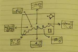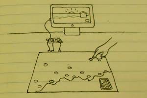 Le Makey Makey est un kit qui transforme les objets du quotidien en éléments tactiles reliés à un ordinateur. Afin de réaliser notre déambulation à travers un paysage crépusculaire, nous avons décidé de créer une carte illustrant ce parcours. Nous avons fixé des points clés sur cette carte permettant une immersion au sein de la carte. Ainsi, nous avons réalisé des vidéos associées aux samples du morceau qui retranscrivent l’ambiance de « Love Like a Sunset ». En touchant un point de contact, l’utilisateur peut voyager à l’intérieur de la carte et recomposer le morceau lui même.