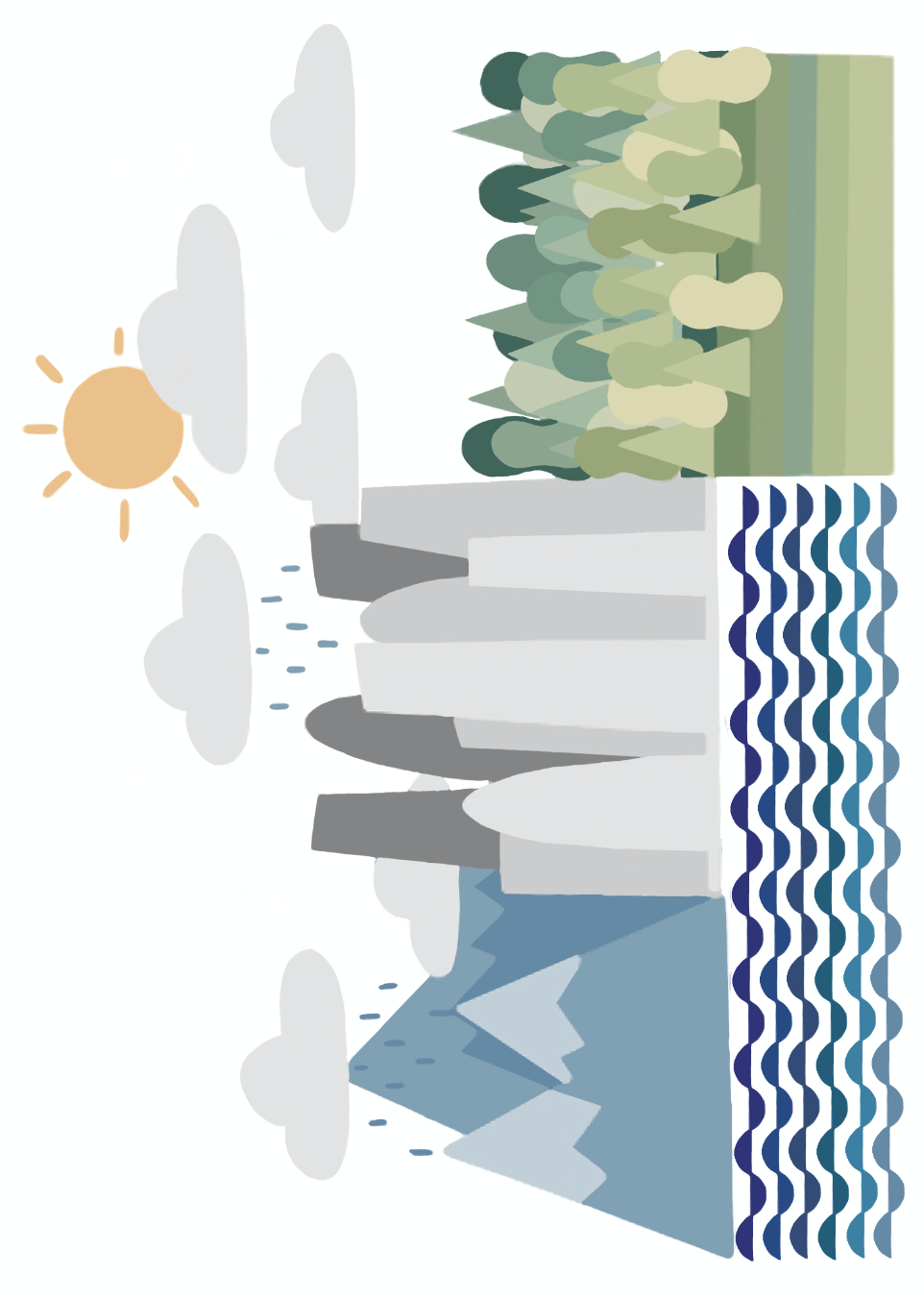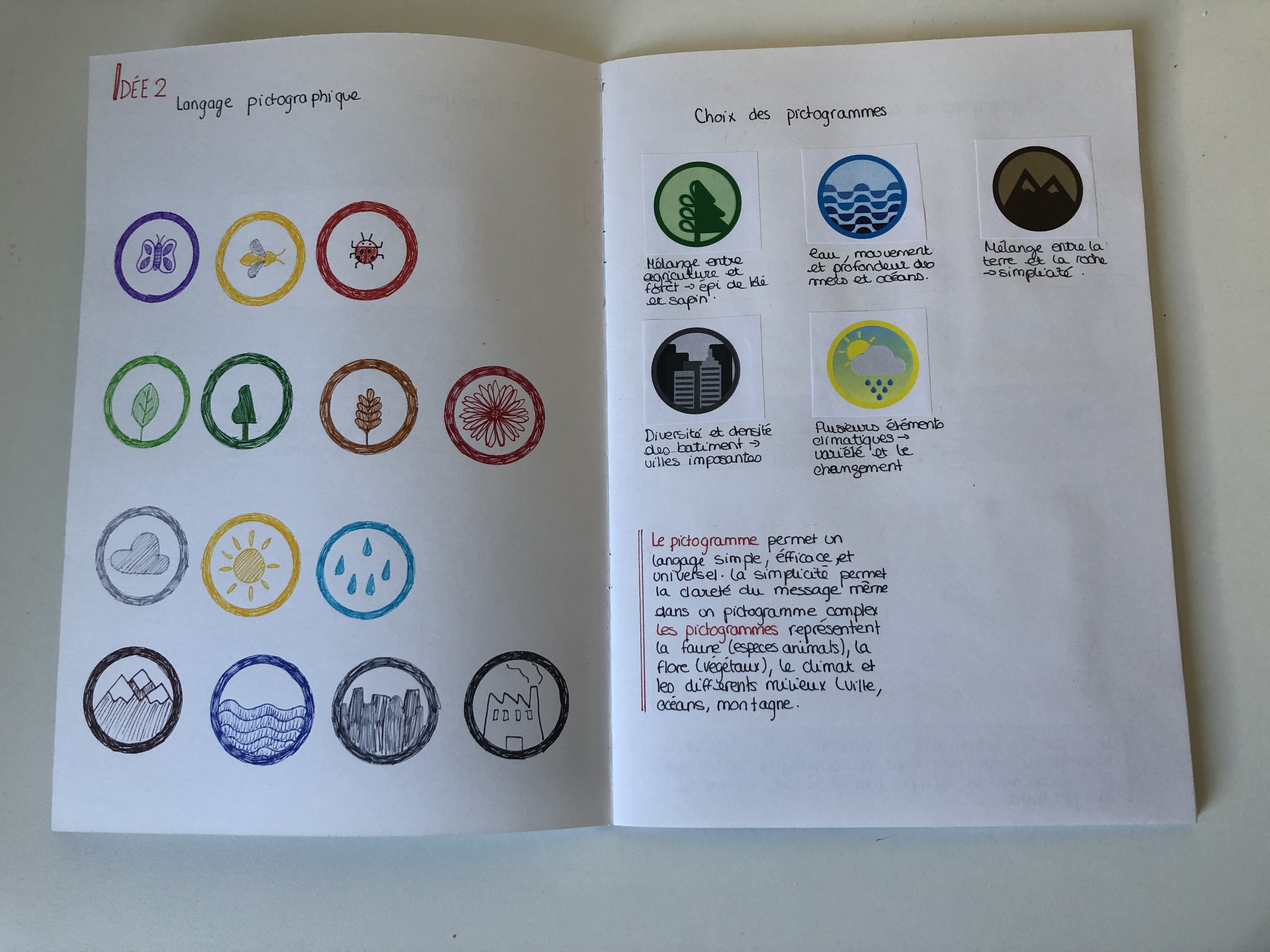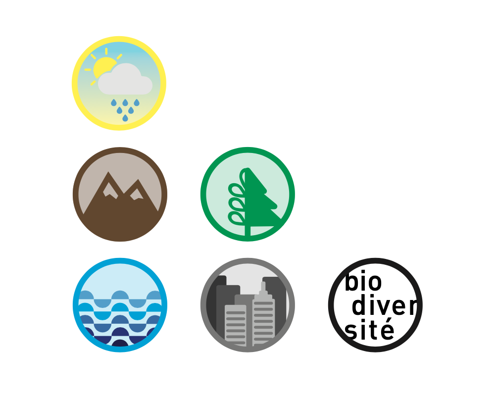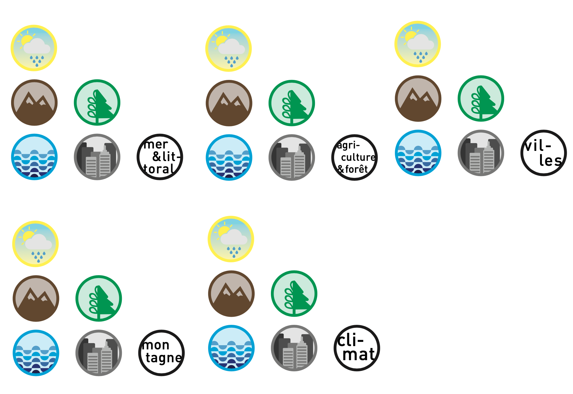 Pour cet axe, l'objectif était de représenter les différents aspects compris dans la biodiversité, c'est-à-dire le climat, les forets et l'agriculture, les massifs, les mers océans et cours d'eau, mais aussi la ville. Le tout dans un langage universel ⇒ les pictogrammes.
