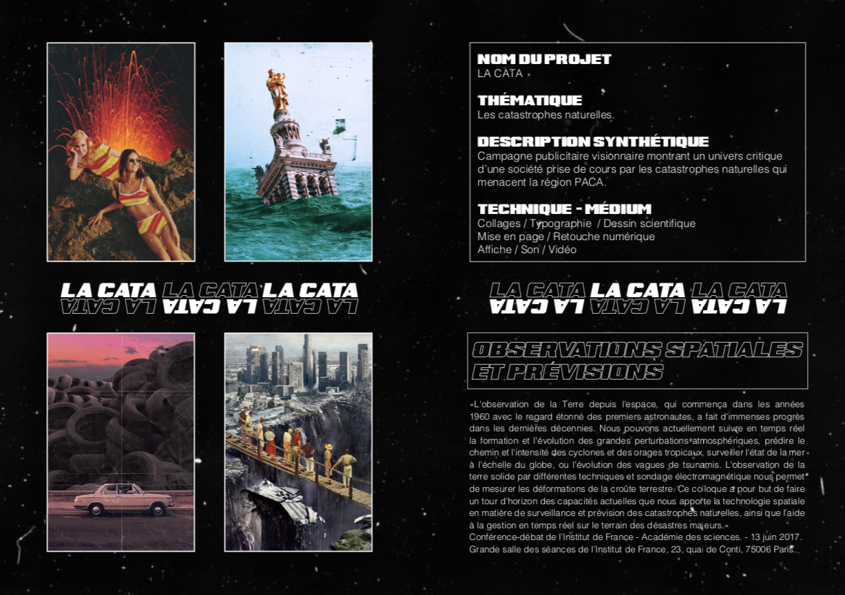 SCÉNARIO / Le studio publicitaire “LA CATA”, créé en 1969, est une entreprise prédisant l’avenir de la planète terre. Alors que les citoyens ne se soucient pas du futur, la planète terre vas de plus en plus mal, au fur et à mesure des années. Notre génération actuelle est arrivée au point final. Cette année vas être le point de non retour. Les catastrophes naturelles se multiplient dans la région PACA, en ayant un impact dévastateur.