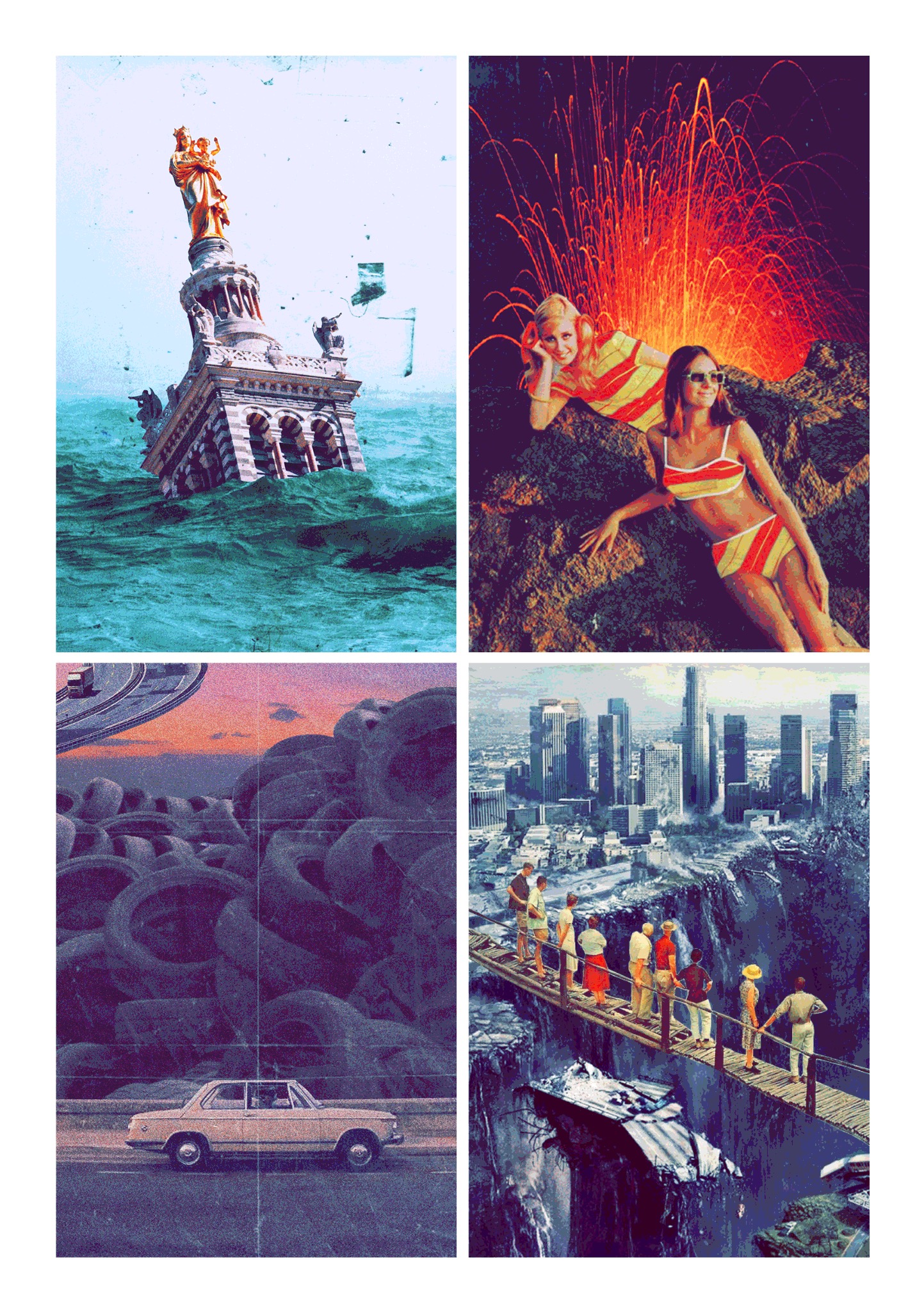 DÉMARCHE GRAPHIQUE / Durant la première partie du XXème siècle, le futur était synonyme de voitures volantes, de robots et de fantasmes futuristes. J’ai voulu représenter l’envers du décor, avec un univers rétro futuriste publicitaire. J’ai choisi de traiter le rétrofuturisme afin de représenter la tension entre passé et futur. Notamment par le biais des techniques variées que j’ai utilisées, tel que le collage et l’informatique.