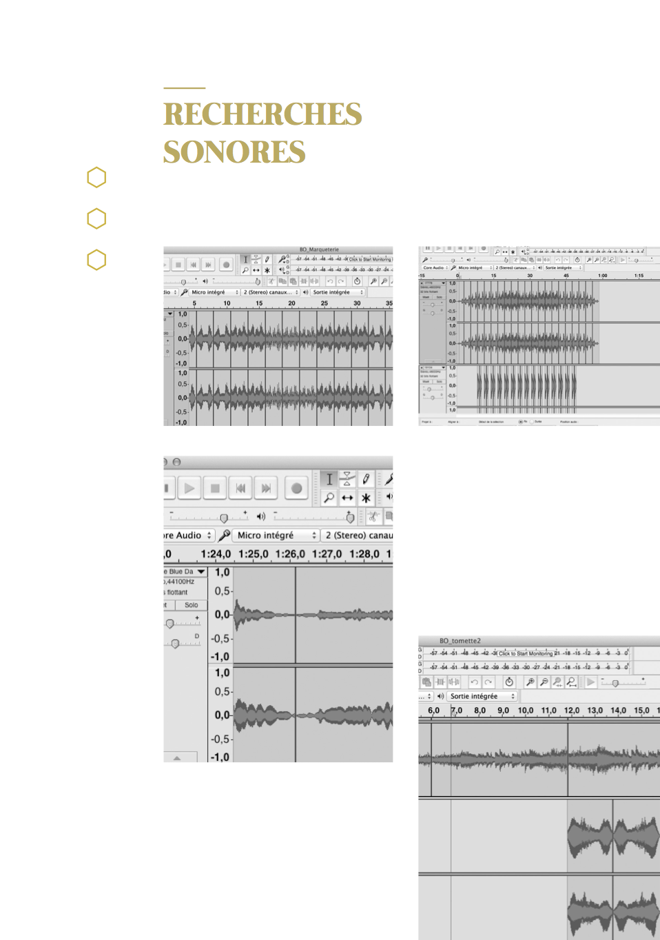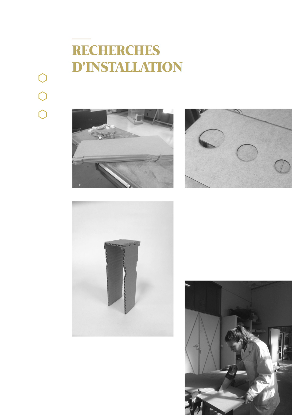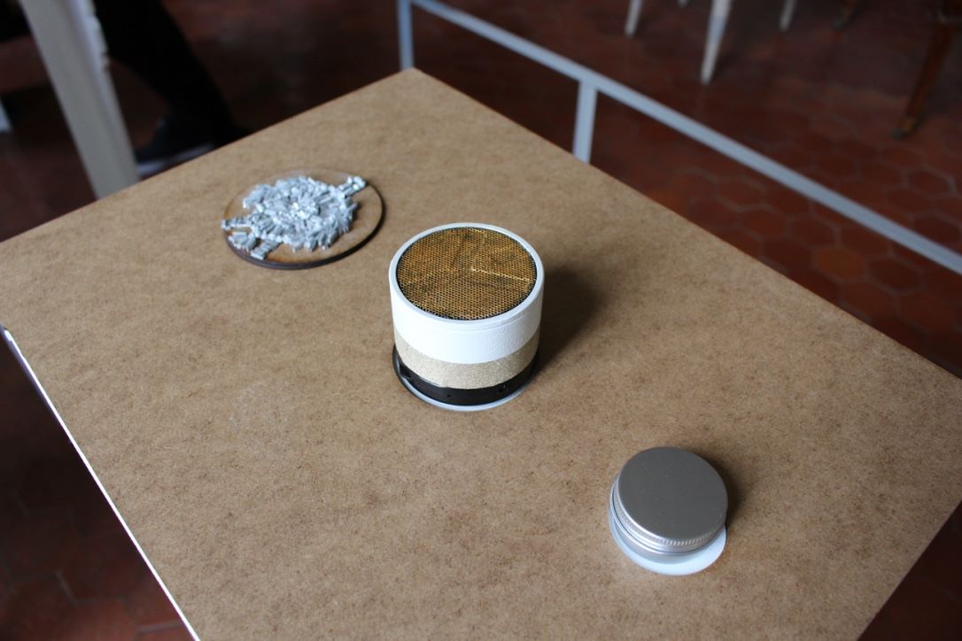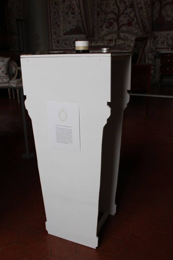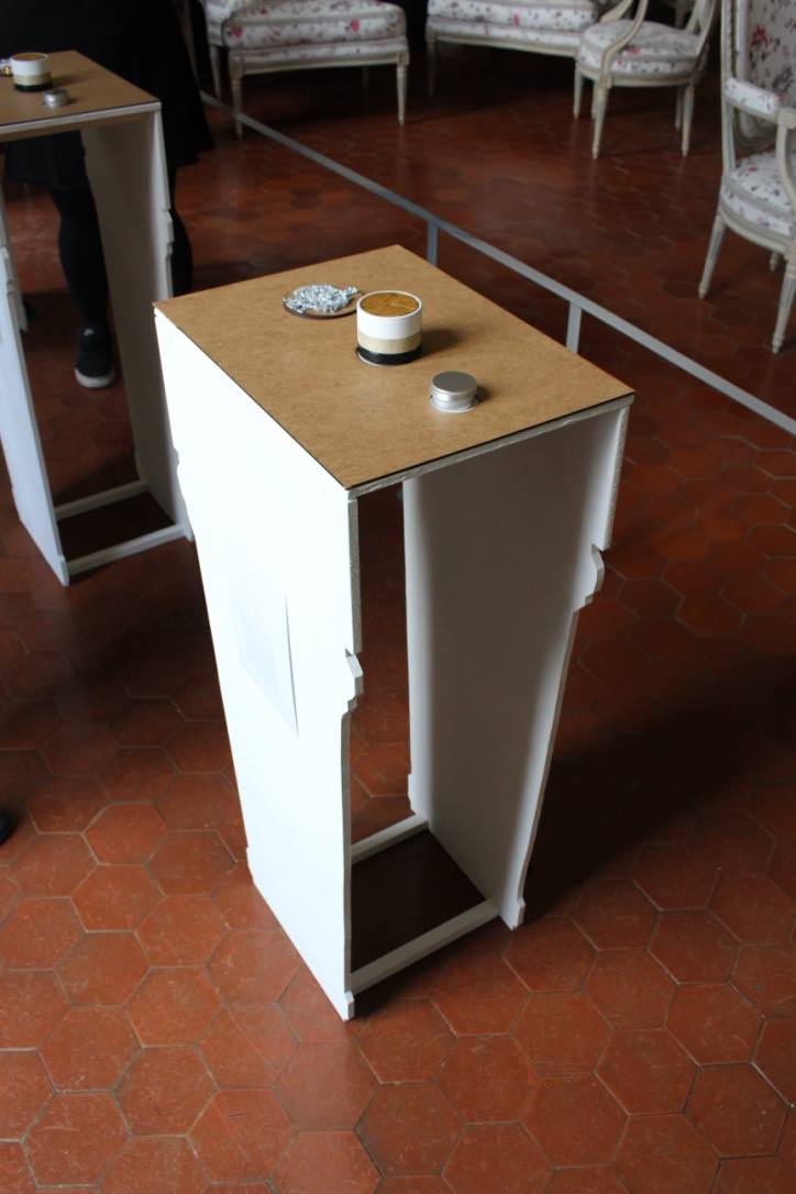 À l’annonce du projet ayant pour thème l’Ornement et le Motif, nous nous sommes orientées vers une approche sensorielle des motifs de la chambre d’apparat au Château Borély. En effet, à travers l’histoire du Château et du 17e-18e siècle, nous avons pu constater que le motif était extrêmement présent notamment sur les textiles, les senteurs et plus précisément les fragrances faisaient partie intégrante de la vie, reflétaient une appartenance sociale et enivrait les espaces. (ex référence Le Parfum de Patrick Süskind). La musique, quant à elle, animait et donnait vie au château (ex Bach, Vivaldi, Mozart) tout comme les différentes conversations et bruitages créaient une atmosphère unique (ex Orgueil et Préjuges de Jane Austen ou encore Les Liaisons Dangereuses de Pierre Choderlos de Laclos). Ces éléments liés aux sens, ont éveillés en nous, l’envie de donner vie aux motifs présents dans la chambre d’apparat, un lieu intime et singulier, témoin d’une époque révolue. La chambre d’apparat est un lieu unique, réservé aux hôtes de marque, ainsi qu’à la dame du logis à la belle saison. elle est représentative d’un statut social. À l’origine de la généalogie de la famille Borély, nous retrouvons Joseph Borély, ainsi que son épouse Claire de Rimbaud, qui fût la première dame à avoir investi ce lieu symbolique qu’est la chambre d’apparat. Cette histoire a de ce fait inspiré le titre du projet « Les Charmes de Claire » comme un hommage. La pièce ici rassemble les meubles les plus précieux du Château, notamment le lit étant la pièce maitresse de l’espace, appuyé au mur, où se dresse une indienne représentant un arbre de vie majestueux, qui trouve sa base dans le lit lui même. Le motif de cet arbre se propage dans toute la pièce, tant sur les murs que sur les meubles et les objets. On retrouve plusieurs volutes en relief faisant office de moulure, où l’on peut distinguer des feuilles d’acanthe. Le nombre conséquent de meubles et d’assises, témoigne d’une volonté de recevoir, et de rendre vivant un lieu intime. La marqueterie d’inspiration italienne, est également présente dans cette chambre, composée de bois nobles, et de nombreux ornements, tel que la serrure. La totalité de la pièce est assise sur la traditionnelle tomette hexagonale provençale, que l’on retrouve dans tout le Château. Elle permet d’avoir un sol lisse, doux et frais. L’atmosphère créée dans la chambre d’apparat, est une représentation d’un ailleurs, bien que tout ici, soit recréée de toutes pièces (cf. prise vidéo de la reconstruction par l’agence Rubigo) Notre interprétation face à ce projet, s’articule sous la forme d’un dispositif sensoriel, composé de 4 présentoirs, dont la silhouette est inspirée des pieds du mobilier de la chambre. Chaque présentoir est la représentation sensorielle d’un motif extrait de la chambre. Sur la partie supérieure de chacun, on retrouve à chaque fois, trois cercle, l’un étant associé au sens du touché, à l’ouïe et à son motif sonore ou Leitmotiv (inspiré par l’oeuvre de Terry Riley) et à l’odorat, la vision étant déjà face au spectateur. Le premier présentoir, est associé au motif de la fleur de vie, le second à la tomette, le troisième à la feuille d’acanthe et le dernier à la serrure. La fleur de vie est représentée à la fois par une broderie délicate, une odeur florale envoutante, et un son printanier s’élevant. La tomette quand à elle, est représentée plastiquement par un moulage en plâtre/béton ?, à la fois poreux, frais, mais aussi doux, vernis et lisse ; un son affirmé, profond, rythmé, et une odeur minérale marquée. La feuille d’acanthe est reprise via la technique du quilling, très largement inspirée des reliquaires domestiques du 17e-18ème siècle, son odeur de feuillage et sa sonorité aux volutes marquées. Enfin, le motif de la serrure se voit représenté par un alliage minutieux en métal (plaque offset), une odeur puissante et boisée en rappel à la marqueterie ainsi qu’un son à la fois grave et mystérieux.