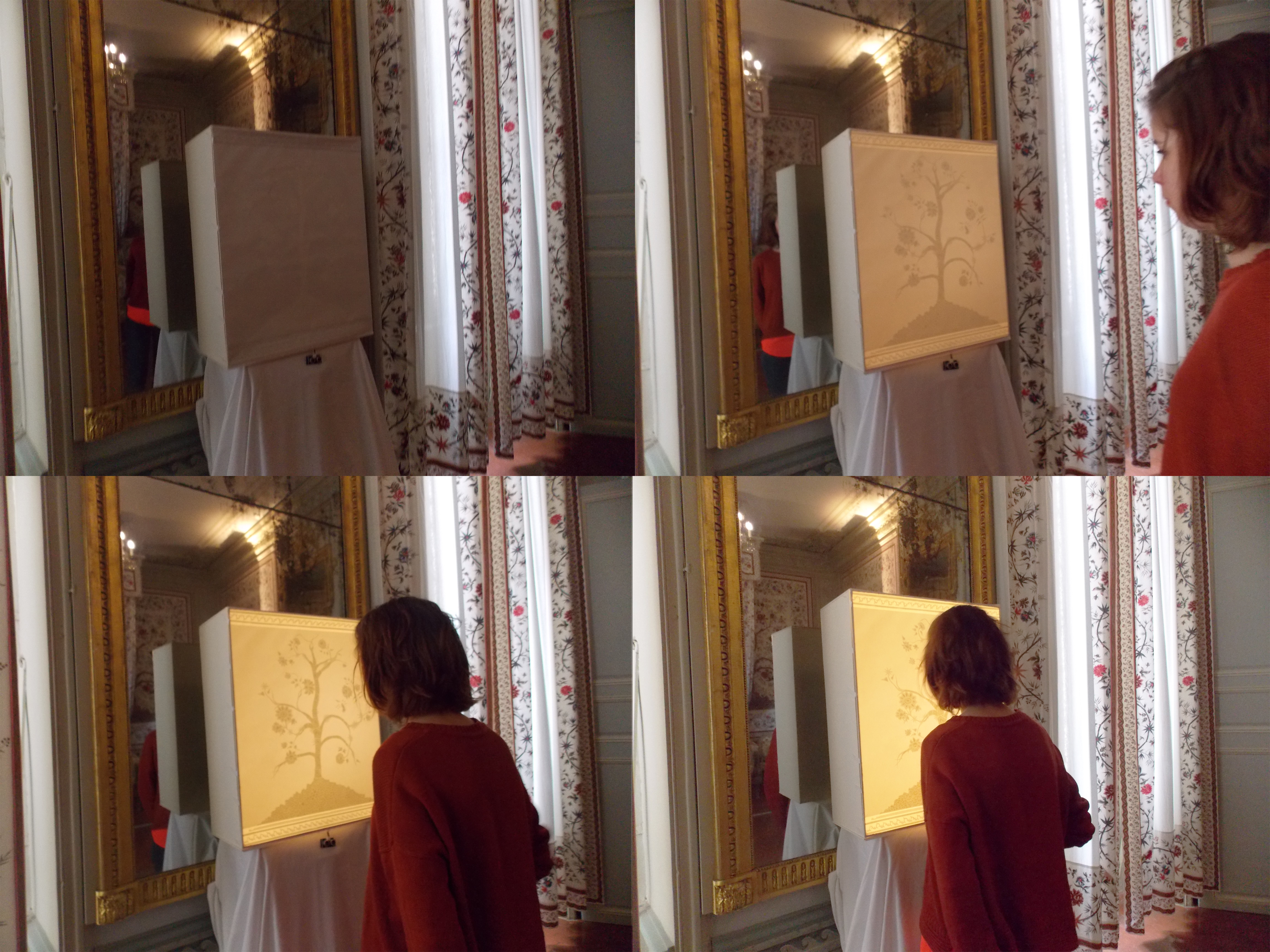 Le motif sur lequel nous avons travaillé est l’arbre sur la tapisserie de la chambre. C’est le meilleur exemple d’incrustation de motifs les uns dans les autres à la manière d’une poupée russe. Pour le mettre en exergue, nous le dévoilons par la lumière et son intensité variera en fonction de la position du spectateur par rapport à l’objet. L’interactivité est ici le moyen de révéler les différentes couches de motifs présents dans l’arbre. Notre but à travers ce travail est de mieux prendre en compte la richesse de cette tapisserie galvaudée en permettant au spectateur de s’impliquer dans le processus d’illumination.