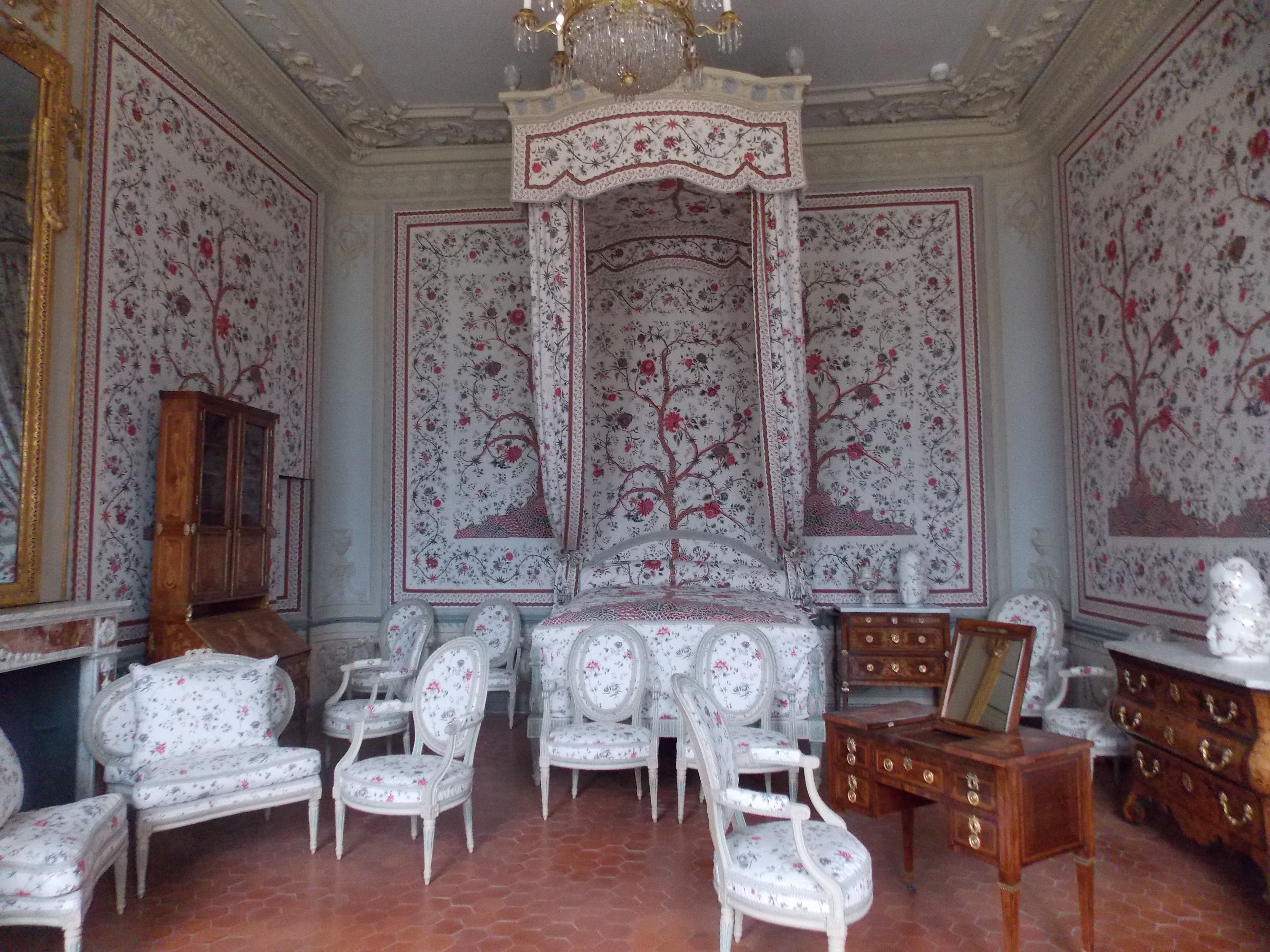 Qu’elle soit dure ou diffuse, la lumière rend les motifs perceptibles. Elle est parfois source de conflit entre chaque élément de la pièce et les met au même niveau ce qui donne une impression de monotonie globale et un effet camouflage. La pièce qui reflète le plus cet état est la chambre d’apparat situé au 1er étage où le mur et le mobilier sont recouverts d’un même motif floral. Cette salle bien qu’étant spacieuse et convenablement éclairée, tous les éléments se confondent. Seul le sol en tomette et les rangements permettent de voir la perspective de la pièce. Nous souhaitons à l’aide d’un dispositif de cadrage lumineux de centrer le regard du spectateur sur des détails qui se perdent initialement dans la scénographie actuelle.