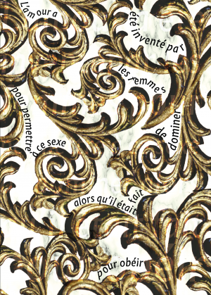 Mon projet est une série d’affiches. Chaque affiche fonctionne par deux. L’une met en valeur la parole sexiste d’un philosophe des lumières et l’autre un extrait de la déclaration des droits de la femme et de la citoyenne, soit la parole de la femme militante avec une déconstruction du motif pour mettre en opposition la valeur qu’on donnait à chacune de ces paroles et celle qu’elles ont encore aujourd’hui. J’ai fait le choix de l’affiche car c’est le support d’expression des luttes, de plus c’est un format qui était déjà utilisé à l’époque, entre autre par Olympe de Gouge. Chaque affiche s’inspire d’un art décoratif et ornemental de l’époque.