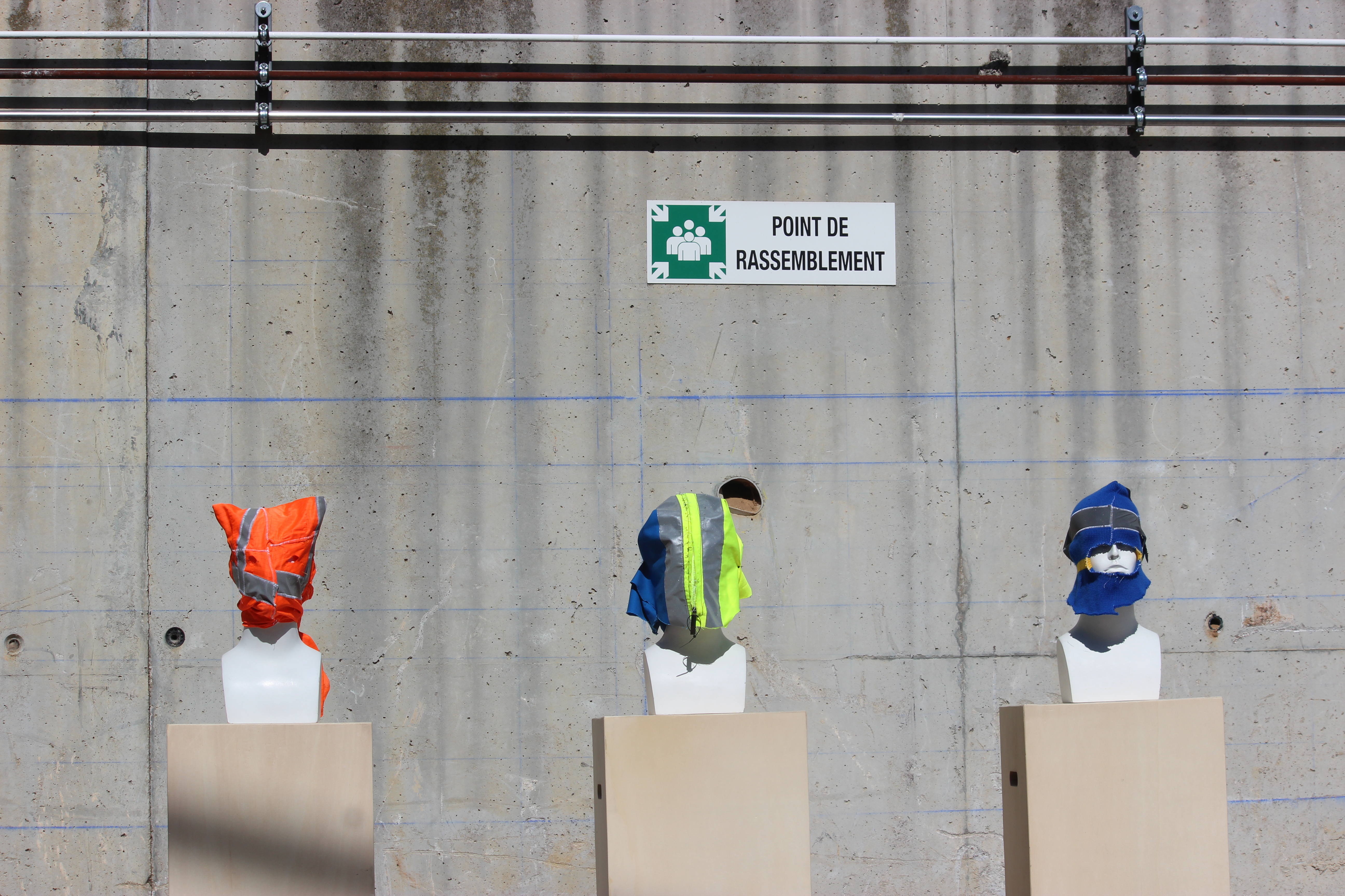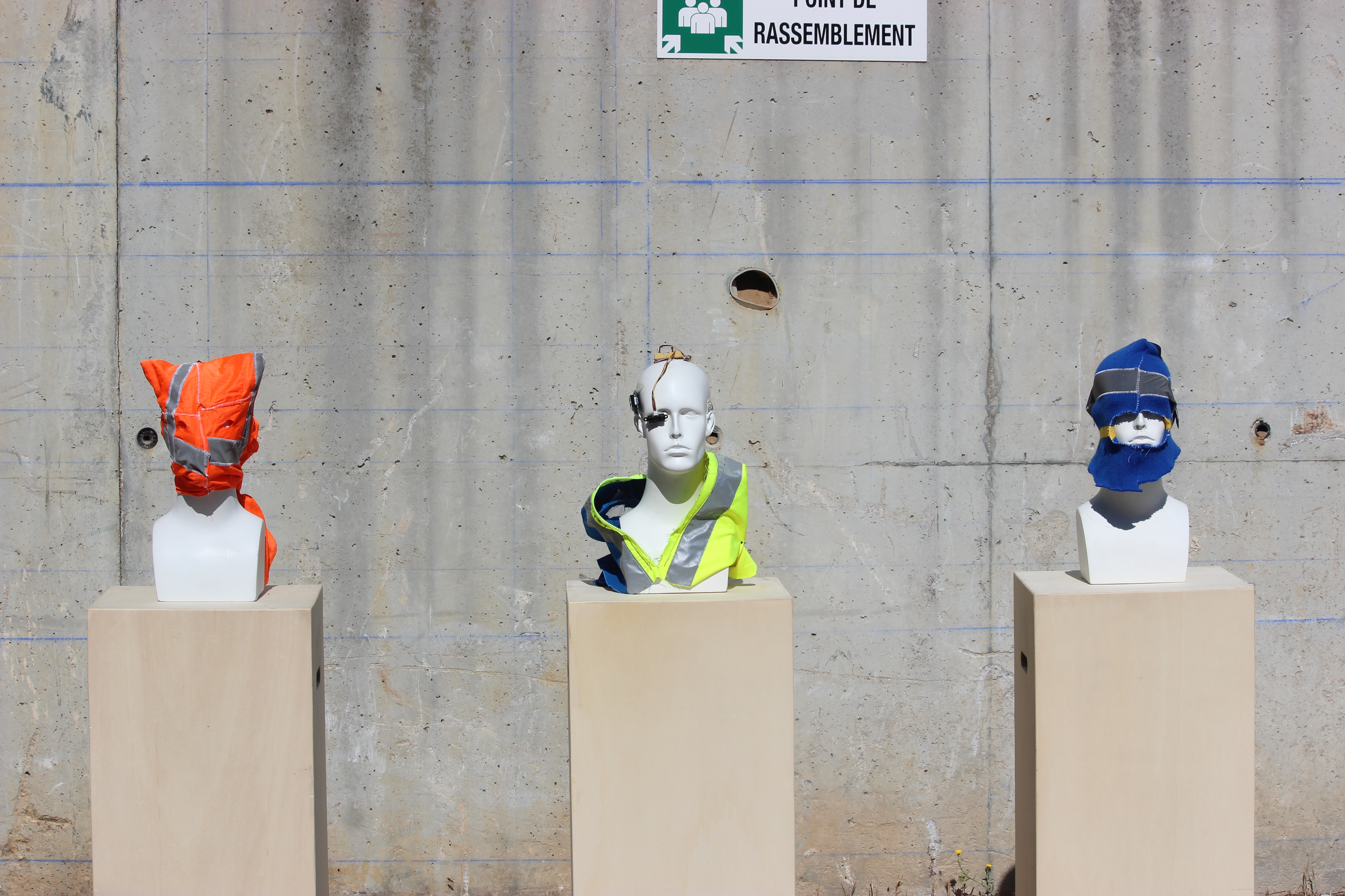 J’ai décidé de créer une installation autours de ces trois cagoule en les mettant en scène dans un paysage en construction le but est de faire tourner les spectateur autours des 3 pièces se sont des éléments en trois dimensions autours qui nécessite une déambulation circulaire*.