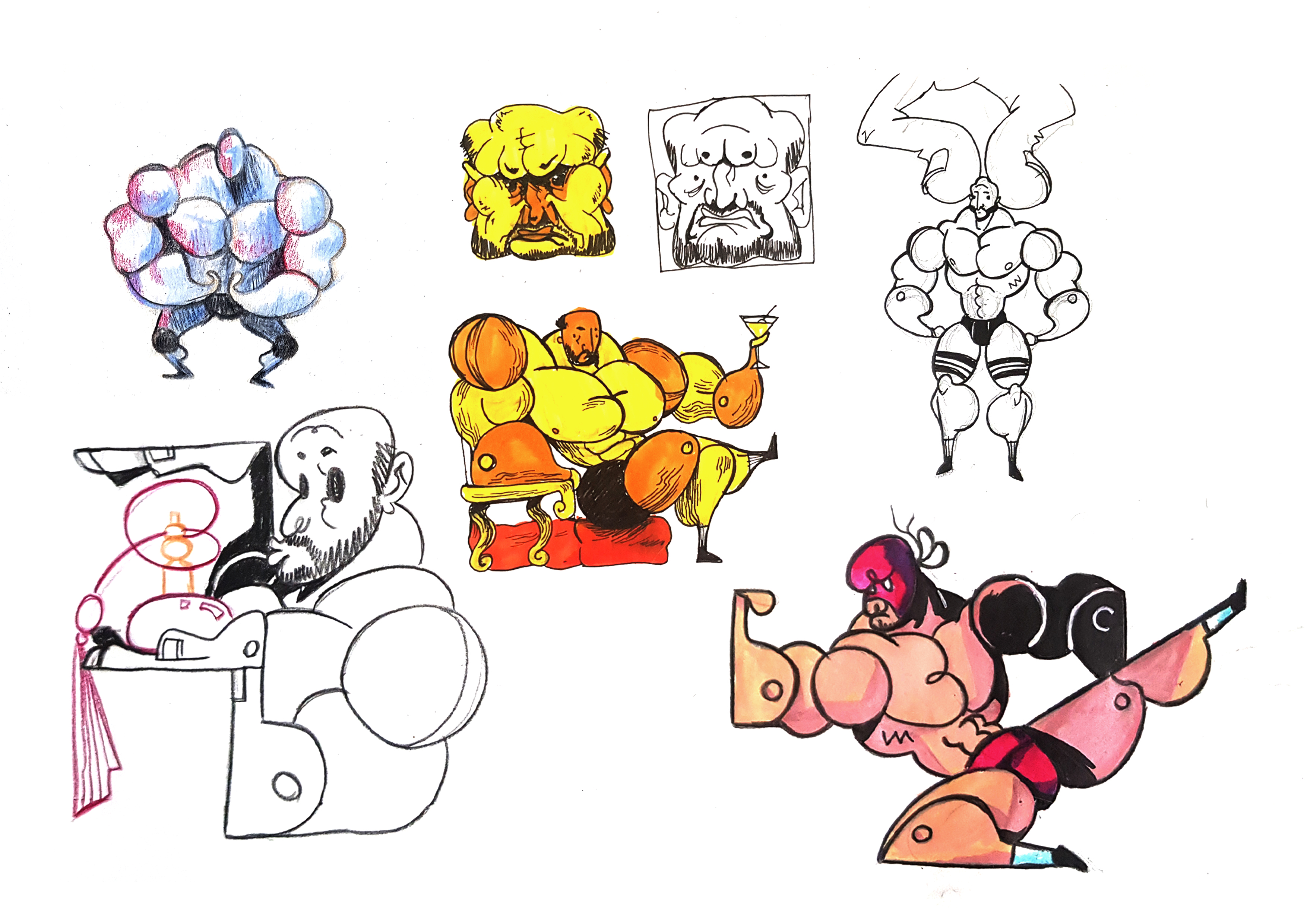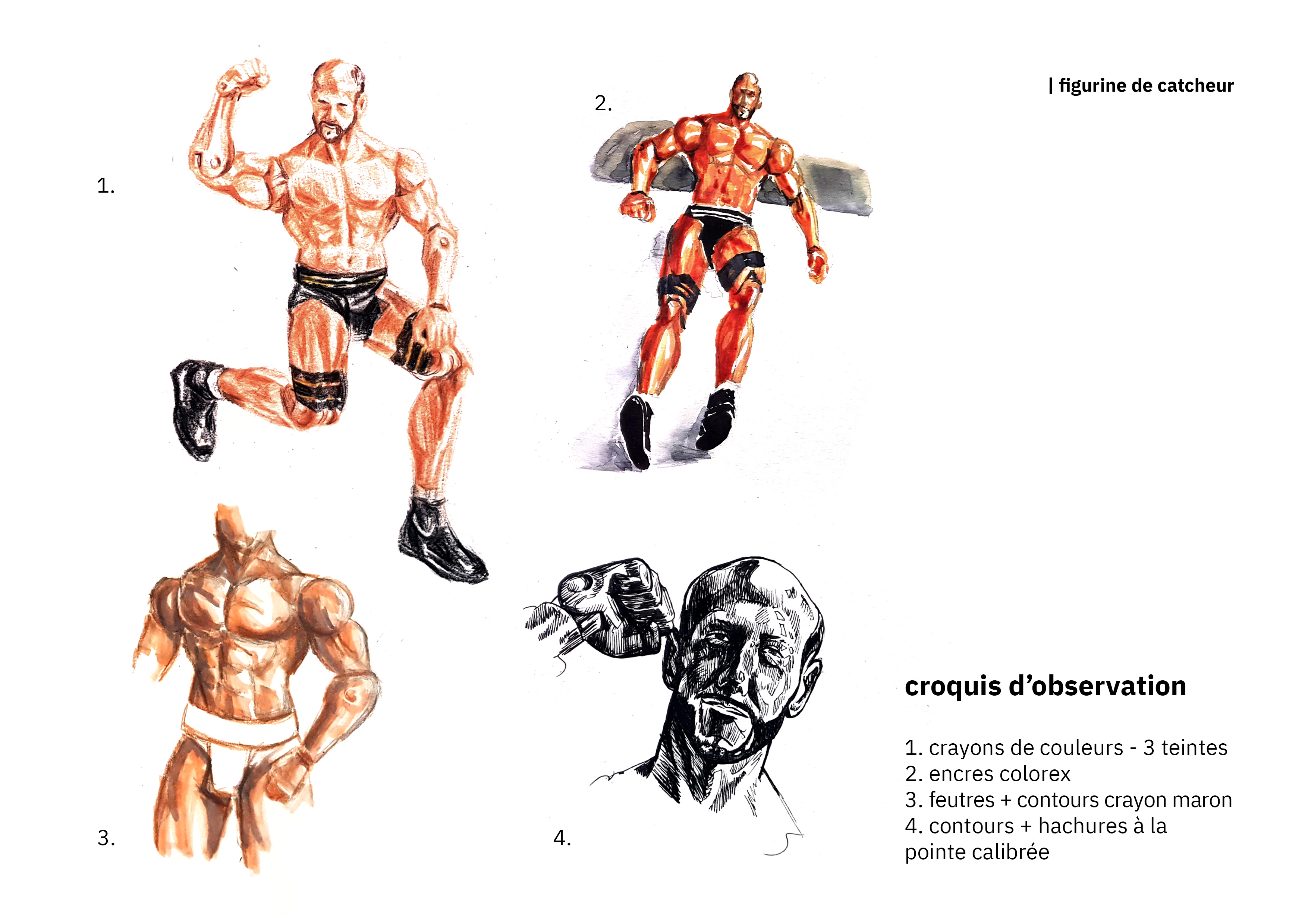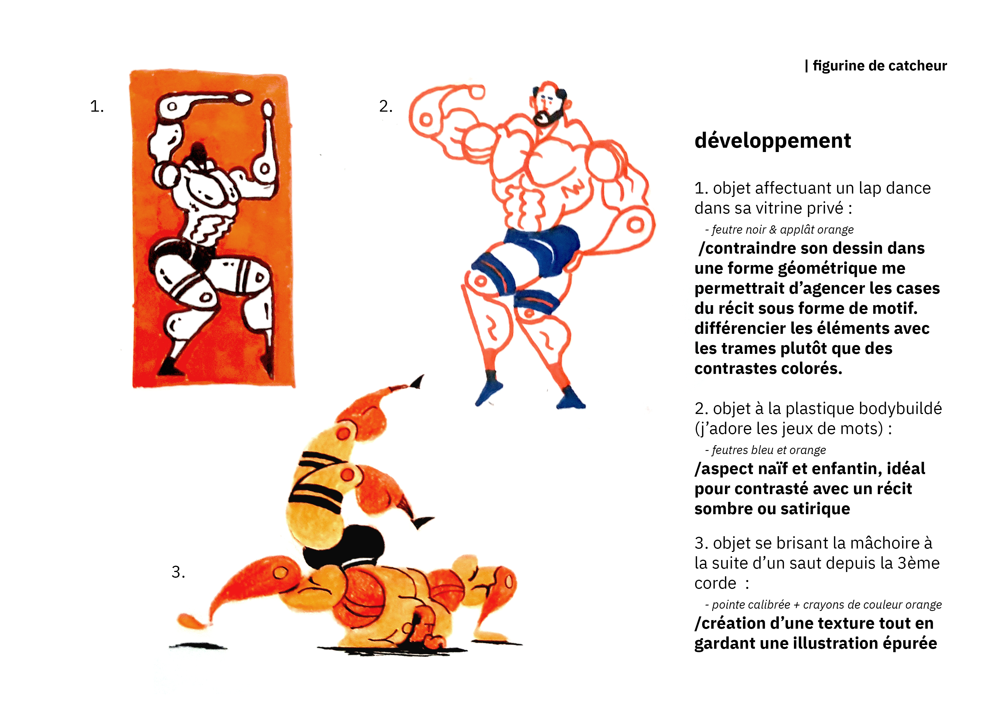 la figurine du catcheur est le personnage principale de mon histoire. Il garde son allure de jouet mais change d'apparence : musculature exagérée s'oppose à son allure androgyne.
