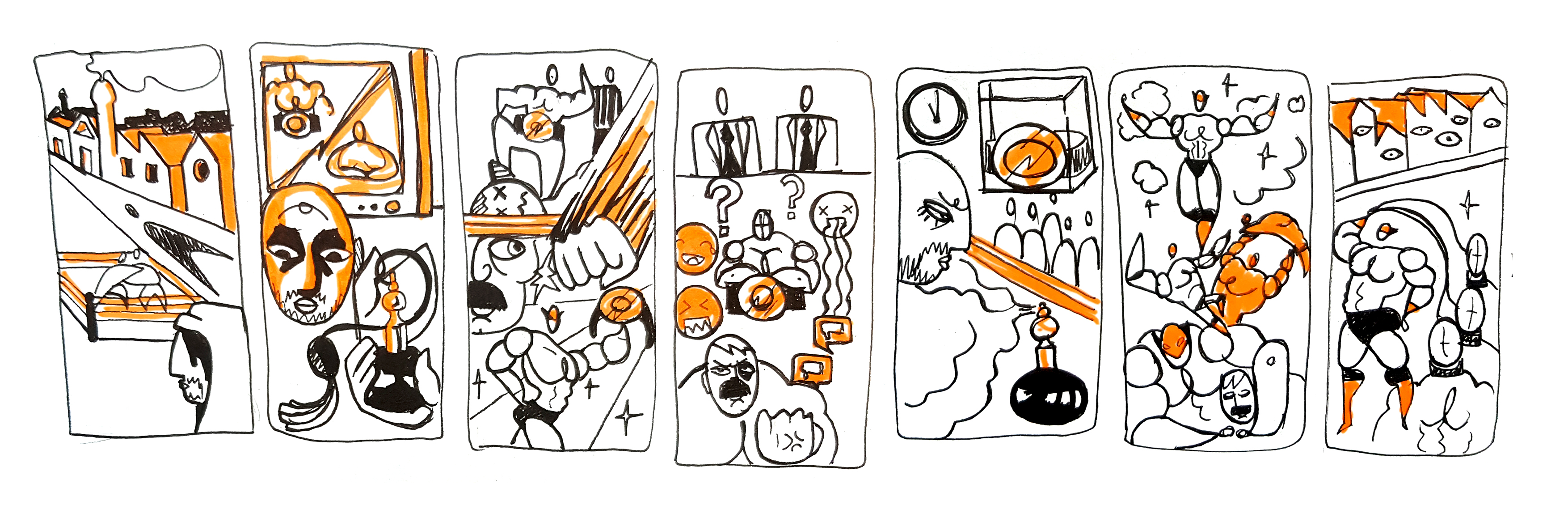 La recherche d'un style graphique s'associe à la recherche de la composition de mon image. En effet je cherche à raconter une scène en une image, sans découper le récit en différentes cases.