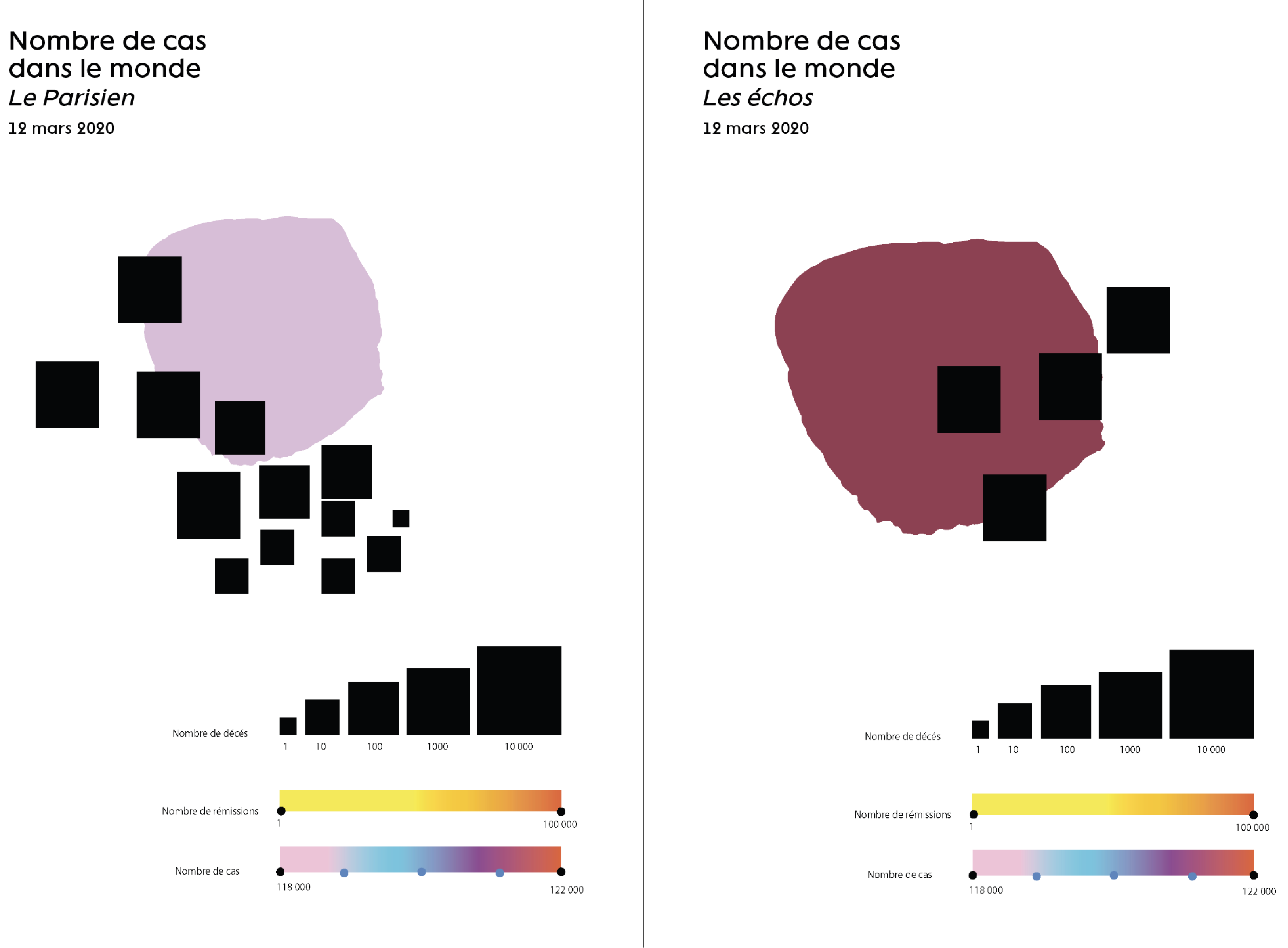 Ici, il s’agit plutôt de comparer la justesse des chiffres publiés par les journaux sur internet toujours à propos du coronavirus. Le visuel permet de représenter visuellement la précision des informations en fonction des journaux, le choix de l’outil informatique se justifie par la notion de justesse de ces informations qui se doivent impartiales et exactes.