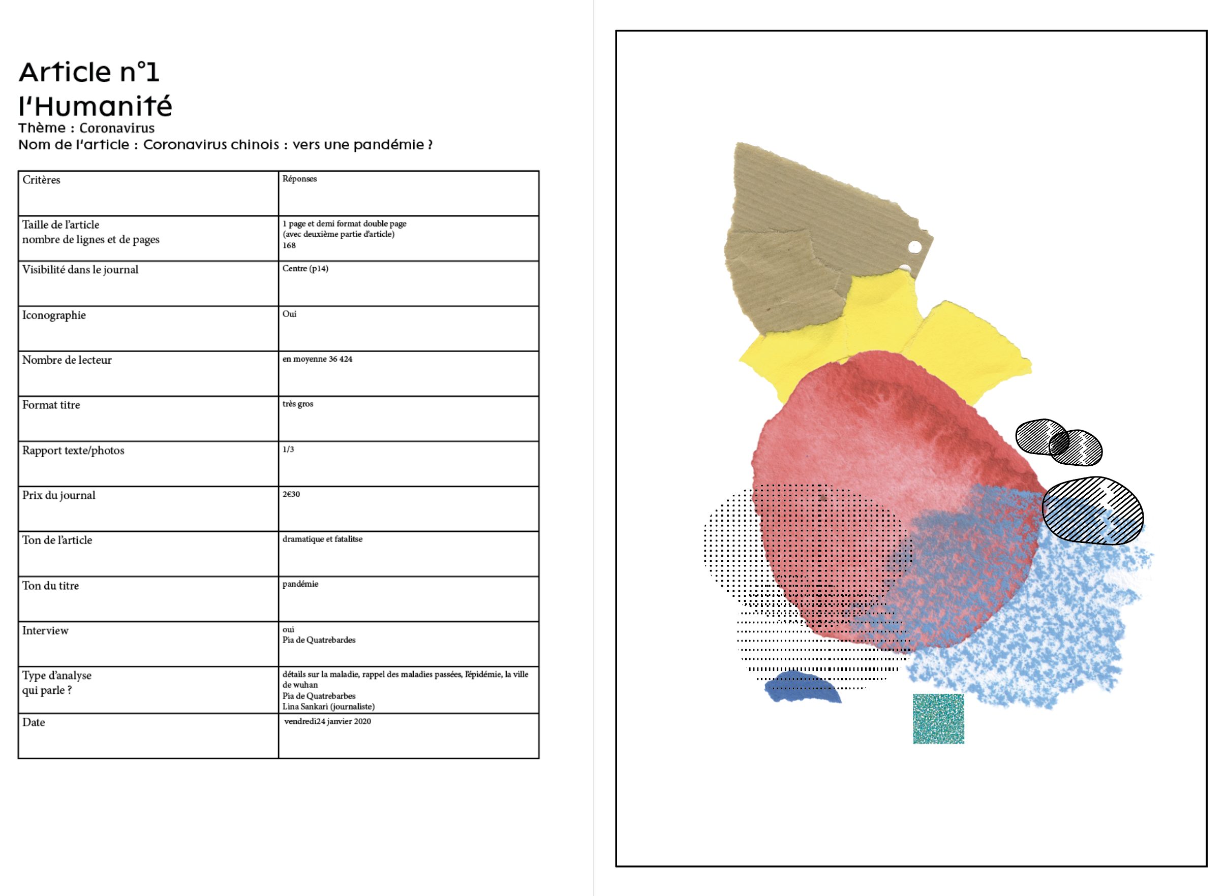 Dans une série de journaux (Le Monde, CNews, 20 minutes, l’Humanité, Libération, Aujourd’hui en France), j’ai extrait tous les articles portants sur le même sujet : le coronavirus. Je les ai ensuite comparés en fonction de la mise en page, de l’importance de l’article dans le journal, du ton, des chiffres, du ressenti du lecteur, du nombre de ligne, etc… pour arriver à une légende de plusieurs médiums (illustrator, aquarelle/craies, et papier découpé). Ensuite, en fonction des données, un visuel est créé pour chaque article.