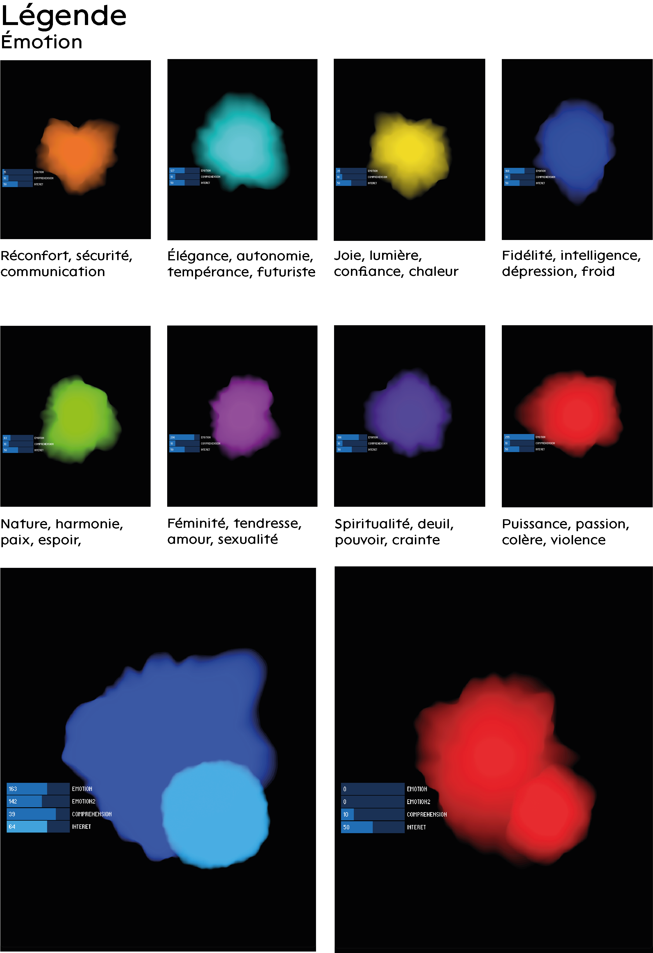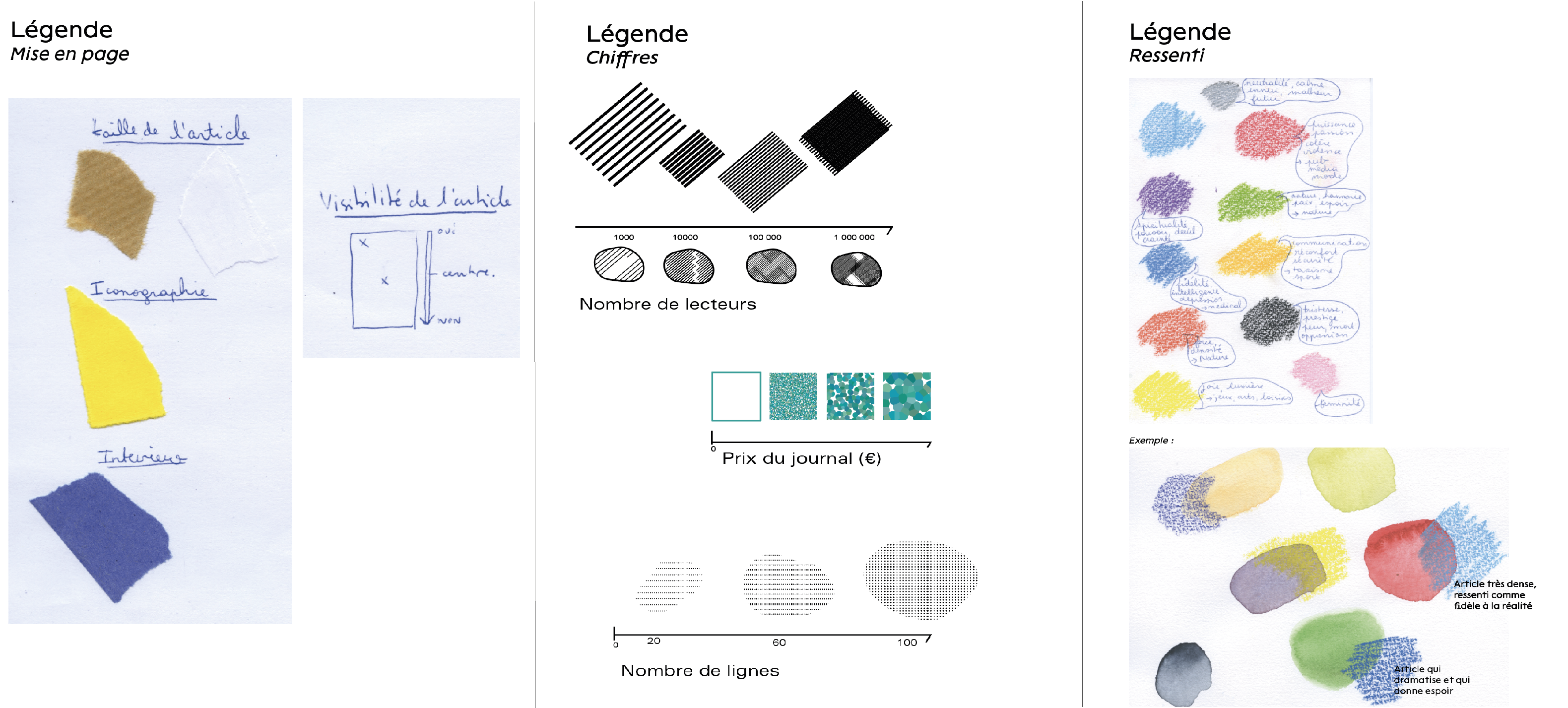 Il s’agit d’une série de petites cartes accompagnées de légendes qui permettent de comparer les journaux, ainsi que d’un programme créer sur Processing permettant au lecteur de lui même modifier la légende en fonction de son ressenti.