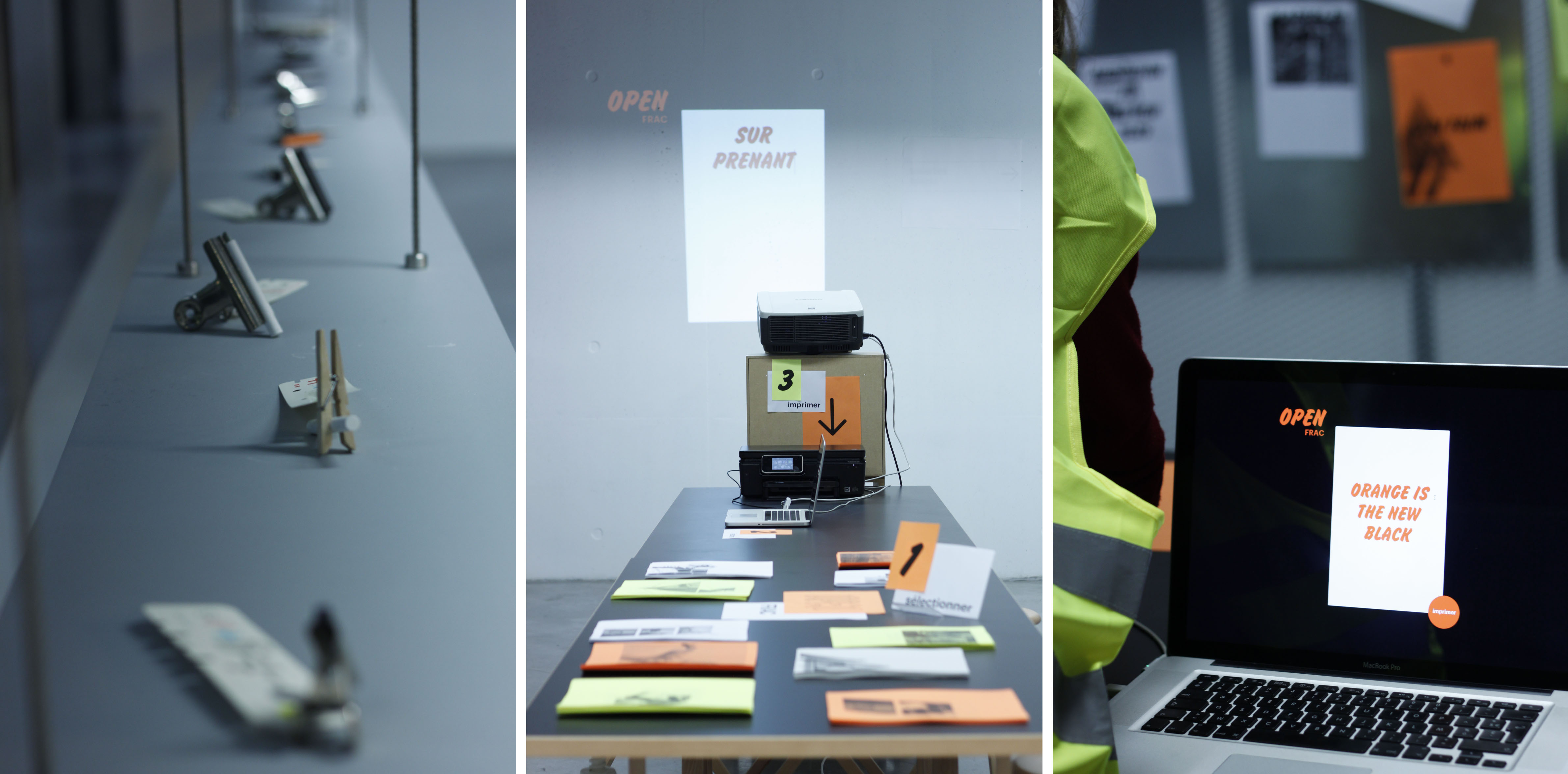 Exposition d'outils (à la manière de Marie Reinert) et de leurs étiquettes codées; Installation de l'Open Frac Generator, où les gens sont invités à venir créer leur affiche, choix du support, couleur, visuel, puis grâce à l'application mise en place par Justine, les personnes viennent inscrire un commentaire, un sentiment, un ressenti de la soirée du vernissage, ou de l'exposition de Marie Reinert. Ainsi ils viennent de créer leur affiche, celle-ci est imprimée, puis ils sont libres de la garder où de l'épingler sur les panneaux installés un peu partout dans le frac. Ainsi le lieu s'anime de nombreux ressentis.