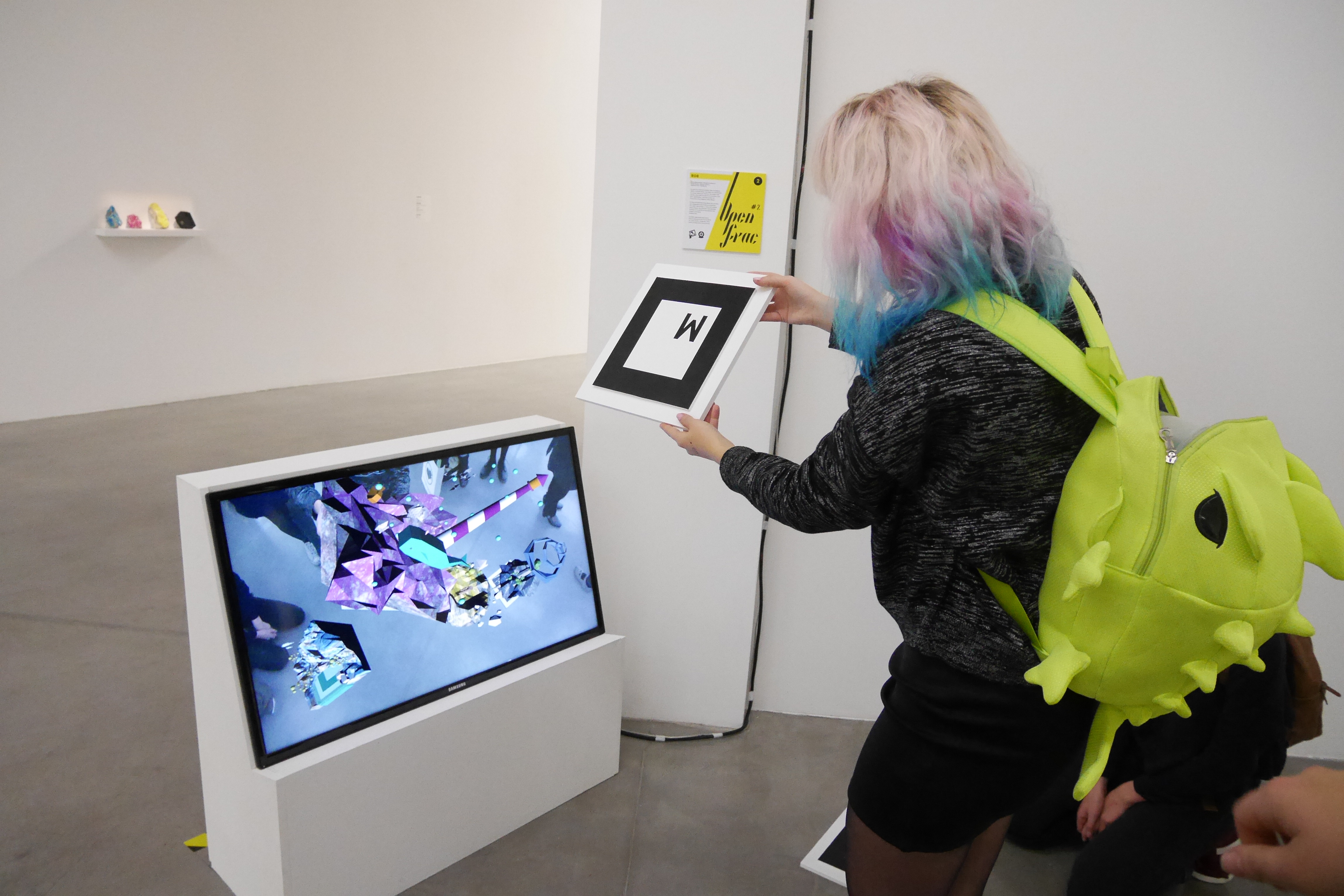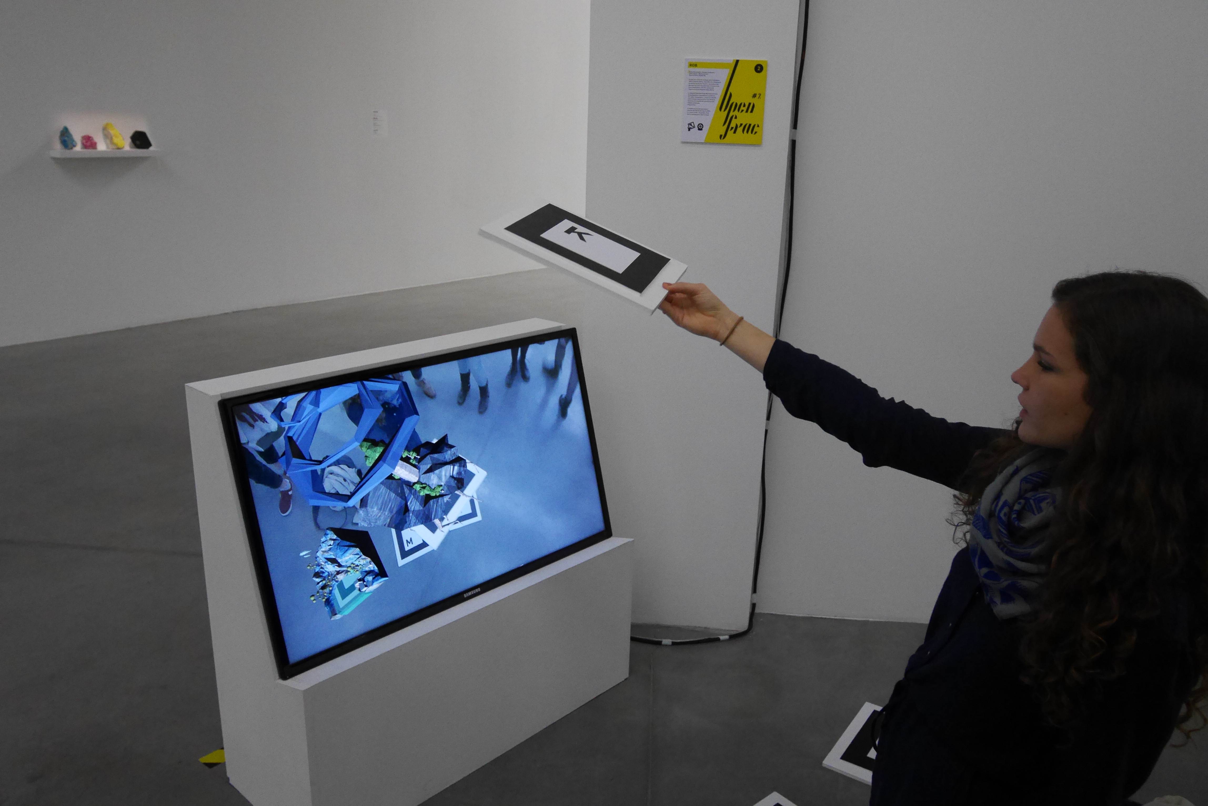 L’artiste Evariste Richer part du principe que tous les éléments avaient déjà été inventés par la nature avant l’homme et que celui-ci se les réapproprie pour les classifier. Le propos de l’artiste est illustré dans l’œuvre CMYK. Il a utilisé ces pierres semi-précieuses pour représenter le monde de l’imprimerie et sa hiérarchie des couleurs. On a observé une seconde thématique dans l’œuvre : celle de la lenteur des éléments confrontée à l’immédiateté de l’image. à partir de ces deux approches et de la technique associée nous avons pu mettre en place une médiation réalisée en réalité augmentée. à chaque pierre colorée nous avons créé un petit monde faisant référence à sa caractéristique identitaire, symbolique (ex: pierre rose = monde aquatique). Les mondes apparaissent en réalité augmentée grâce à des marqueurs de grande taille disposés au sol, grâce à un programme sur le logiciel processing, la webcam reconnaît les marqueurs et génère la réalité augmentée sur un écran de télévision. Nous avons voulu ré-exploiter la texture des pierres dans nos mondes miniatures. Ceux-ci ont été modélisés sur le logiciel 3D blender. Notre installation a été établie de manière parallèle à l’œuvre pour garder un contact direct avec celle-ci tout en invitant à s’y plonger davantage.