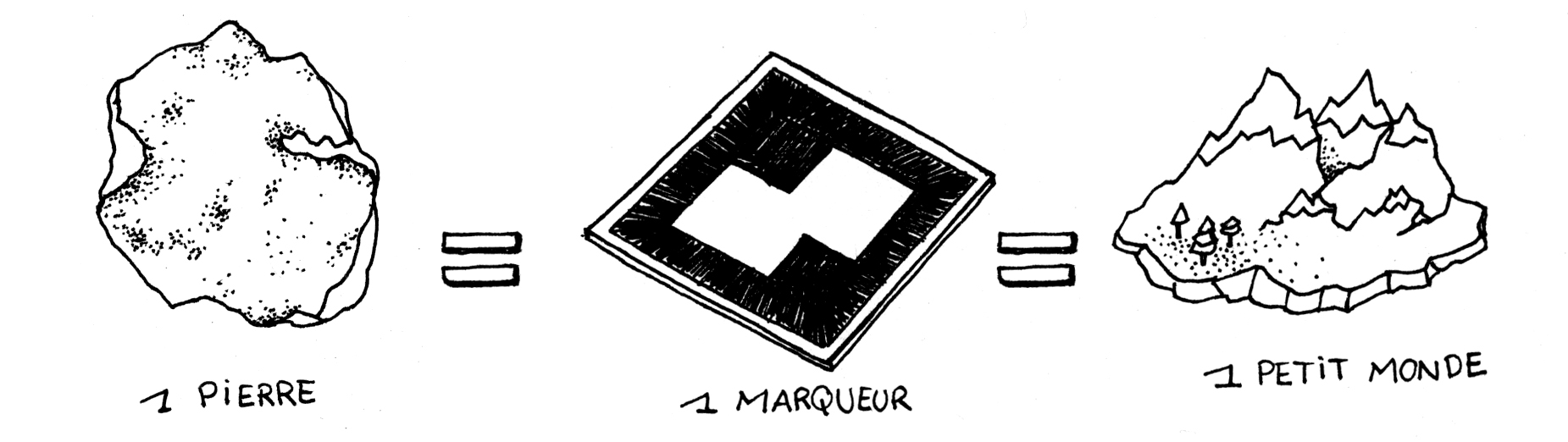 À partir des couleurs de chacune des pierres - Cyan, Magenta, Jaune, Noir - nous allons créer un petit monde tel qu'un petit cabinet de curiosité portatif, pour chacune des quatre pierres. Les mondes apparaissent en réalité augmentée grâce à des marqueurs de grande taille posés au sol. Chacun de ces mondes est unique, il possède des caractéristiques propres à la pierre, créant ainsi un véritable univers vivant pour chacune des pierres. Pour recréer numériquement la texture et la forme des pierres, nous pensons utiliser la technique de la photogrammétrie*, permettant d'obtenir un modèle 3D d'une surface ou d'un volume. Les données obtenues seront ré-exploitées pour concevoir les mondes en 3D sur Blender.