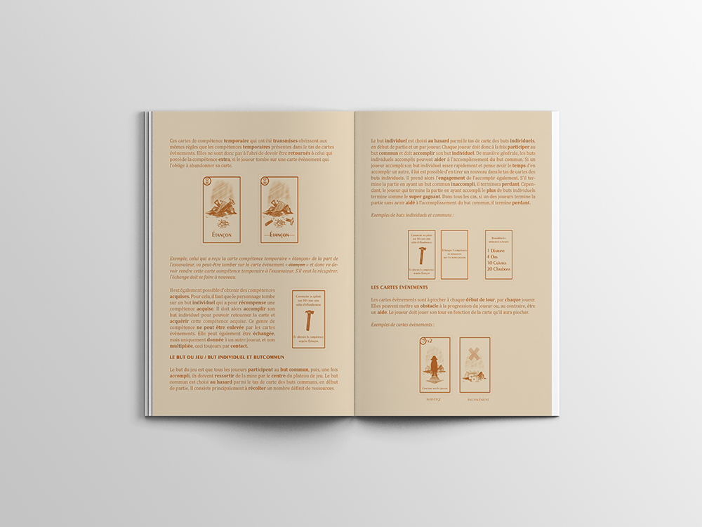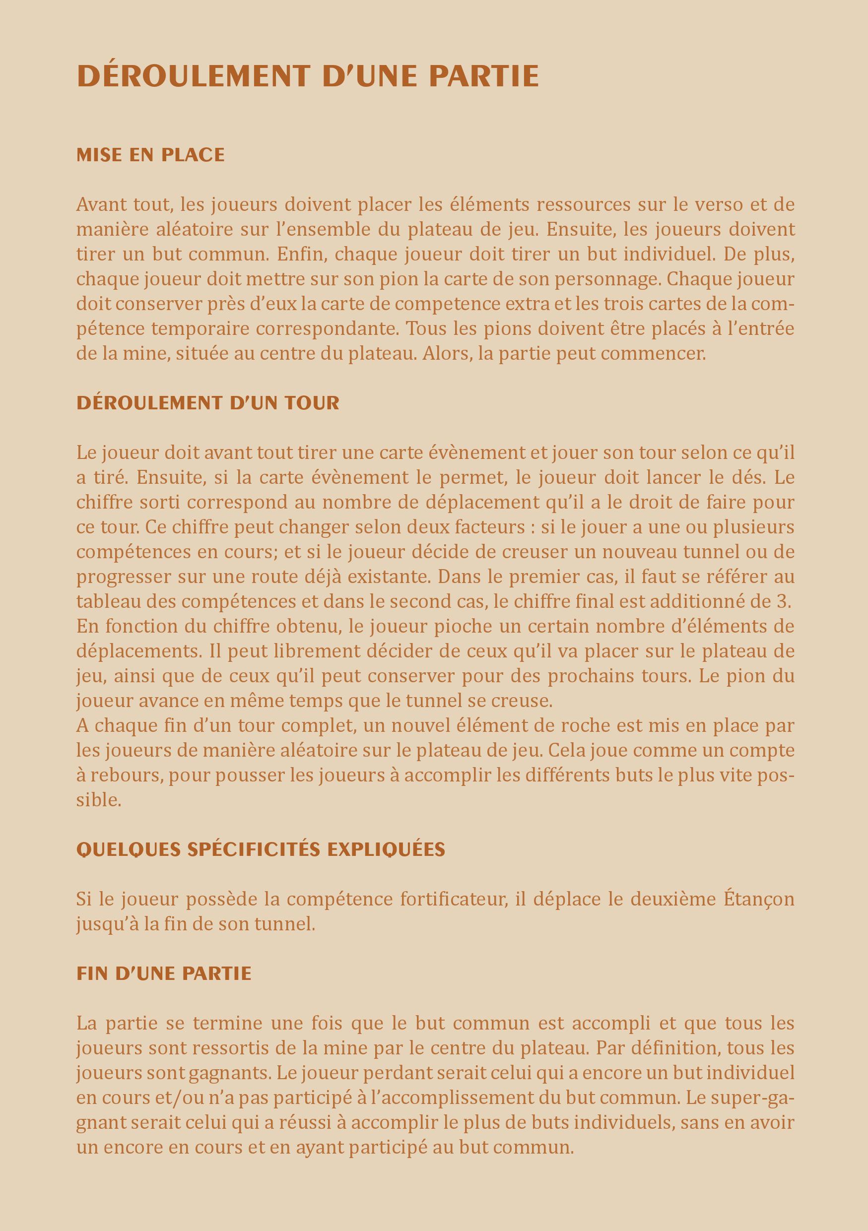 La compétence Lumière : Permet un bonus de déplacement. La compétence Piocheur : Permet un bonus de déplacement. La compétence Fortificateur : Permet d'empêcher que des éléments roches se mettent sur le chemin que celui qui a la compétence, a creusé. Cet étançonnage se matérialise sous la forme de deux Étançons qui sont mises au début et à la fin du chemin en question. Si une personne gagne la compétence en plein milieu d'un tunnel, le début de cet étançonnage se fera à cet endroit. Et si une personne perd la compétence durant sa progression, la fin de l'étançonnage se fera également à l'endroit où le pion se trouve. Il se peut ainsi que plusieurs étançons soient placés à différents endroits sur le plateau de jeu. La compétence Dynamitier : Permet de détruire un élément de roche ou de déplacement qui peut se trouver sur son passage. Si un joueur possède une seule carte compétence acquise ou compétence temporaire de dynamite, alors il peut détruire tous les rochers tant qu'il ne pers pas sa carte.