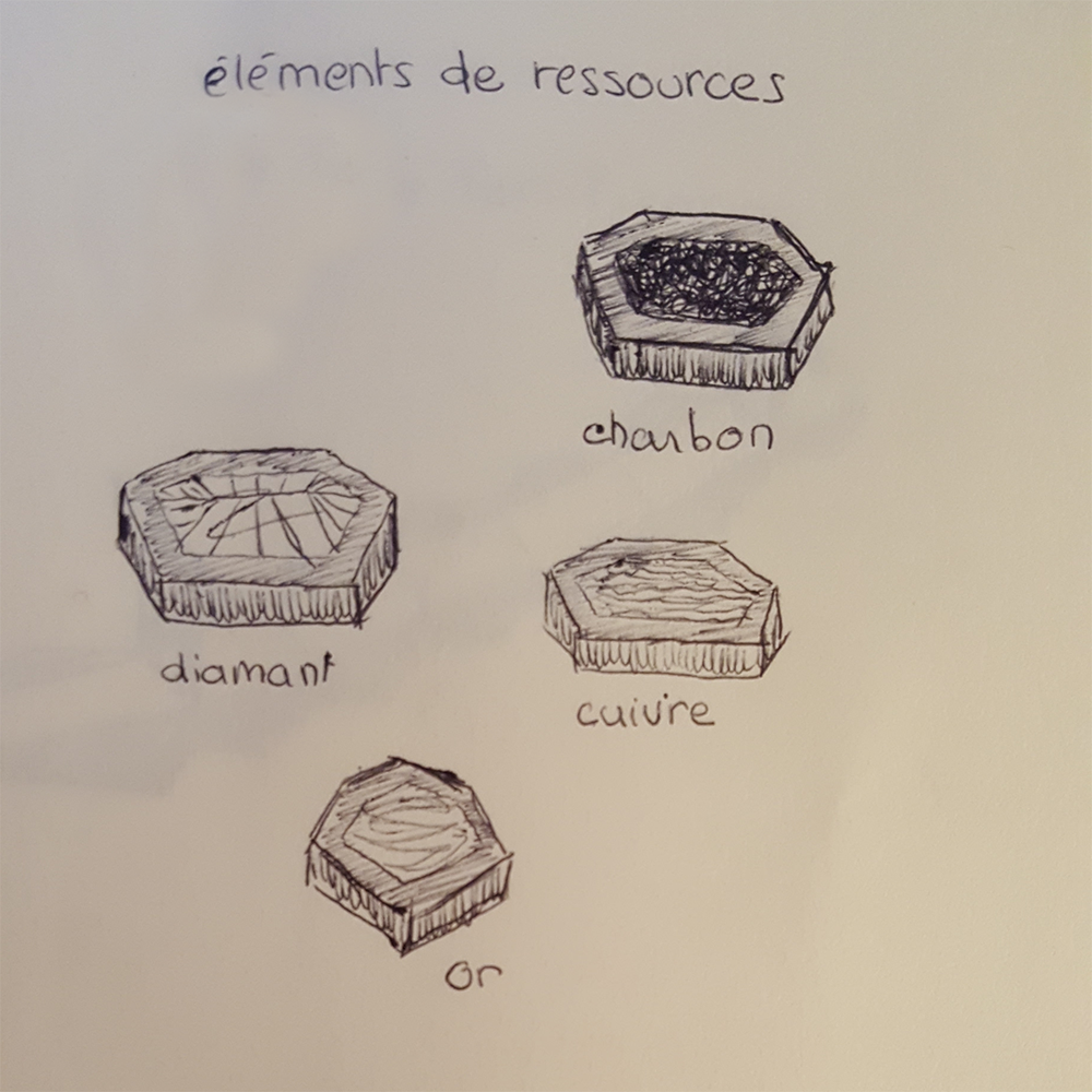 Il existe 4 éléments de ressource dans le jeu. Le charbon est le plus courant (20 éléments), c'est ensuite le cuivre (12 éléments), puis l'or (8 éléments) et enfin le diamant (5 éléments). Un élément de ressource peut être récolté uniquement si le personnage a assez d'élément de déplacement pour le remplacer sur la case. Plusieurs éléments peuvent être récoltés dans un même tour, tant que le personnage souhaite utiliser ses éléments de déplacement. Le tour se termine lorsqu'il décide de ne plus avancer, ou qu'il n'a plus assez d'élément de déplacement à sa disposition.