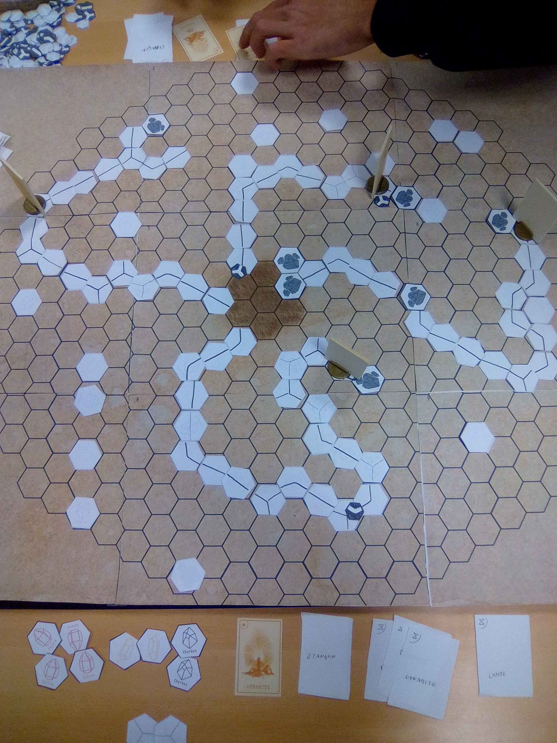 Les éléments de ressources doivent être retournées sur le verso, et placées de manière aléatoire sur l'ensemble du plateau. Ainsi, chaque joueur qui creusera un tunnel vers une ressource découvrira la nature de la ressource que lorsqu'il sera dessus et qu'il la récoltera. Les joueurs doivent commencer et terminer la partie par l'entrée de la mine, qui est au centre du plateau. Les éléments de roches tombent de manière aléatoire, fait par les joueurs, à chaque fin de manche sur l'ensemble du plateau, sauf sur les parties entourées d'Étançons des tunnels. Chaque joueur a la liberté de disposer comme bon lui semble les éléments de déplacement qu'il pioche.