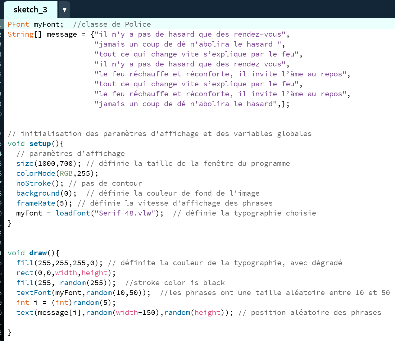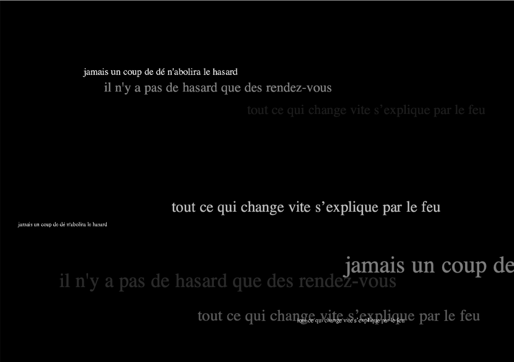 En effectuant mes recherches, j'ai trouvé plusieurs références littéraires et philosophiques sur le feu et le hasard : La psychanalyse du Feu de Gaston Bachelard, Mallarmé, Paul Eluard. … Elles m'ont permises d'étayer mes recherches et ma réflexion. J'ai donc décidé d'accompagner ma vidéo d'une animation Processing autour de ces citations qui m'ont marqué et qui m'ont permise d'approfondir mon concept.