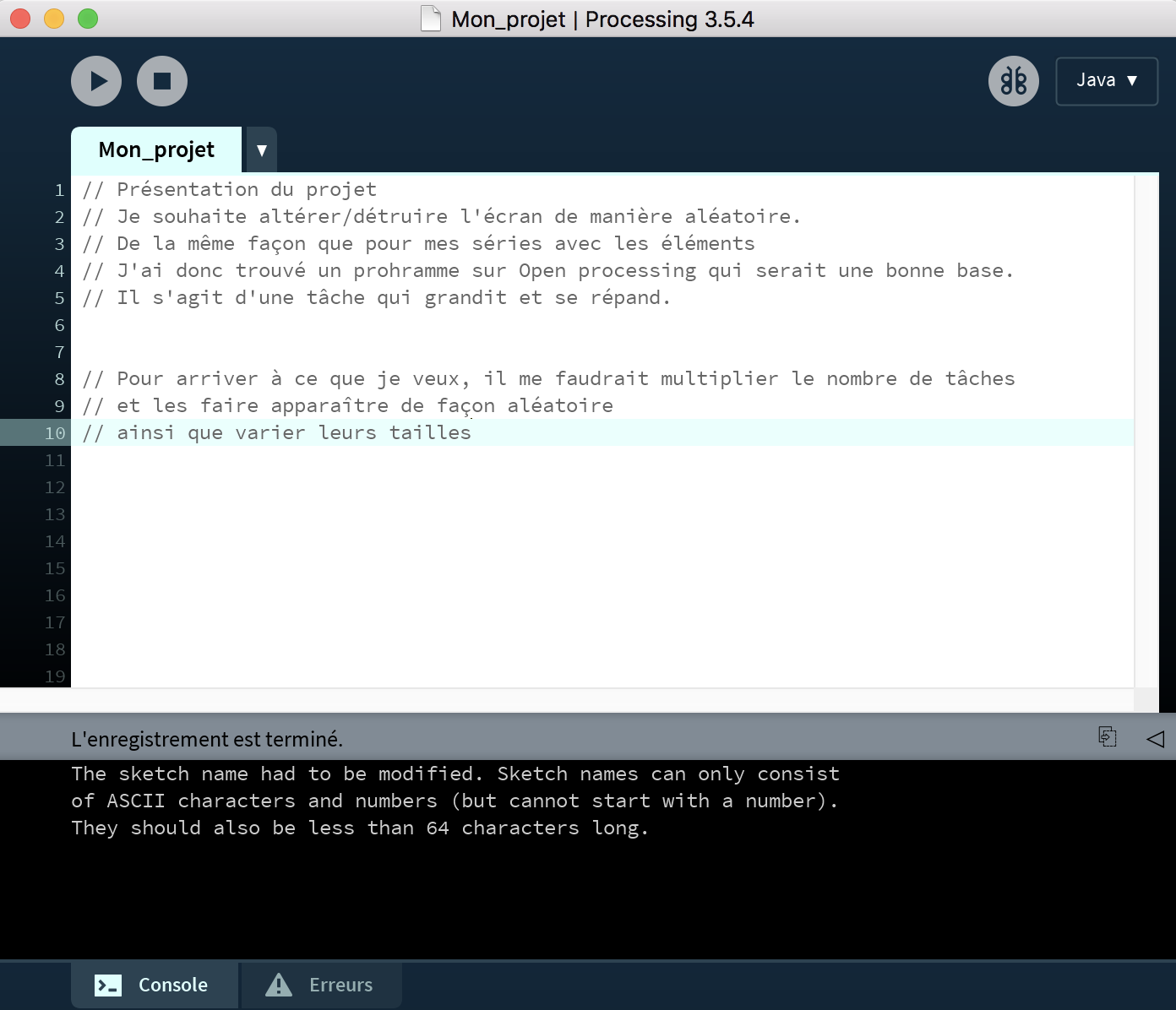 Le plan du Wiki est partiellement respecté. Il manque des titres “balises” que je me suis permis de rajouter. La présentation du sujet est plus que sommaire mais vos intensions sont claires. Vous donnez une explication du fonctionnement du programme dans une image représentant l'entête d'un programme Procesisng. Il serait plus intéressant de l'avoir dans un texte à part entière. Vous donnez une référence de programme sur OpenProcessing et des intensions, mais vous ne modifiez pas le programme initial pour parvenir à vos intensions.Vous commentez le programme ce qui vous permet de comprendre son fonctionnement et son algorithme. Malheureusement vous mettez pas en oeuvre vos intentions. Vous pouvez rajouter une image d'illustration de son fonctionnement. Il faudrait rajouter un lien sur le dossier compressé de votre programme. Il faut continuer et approfondir vos recherches et vos travaux…