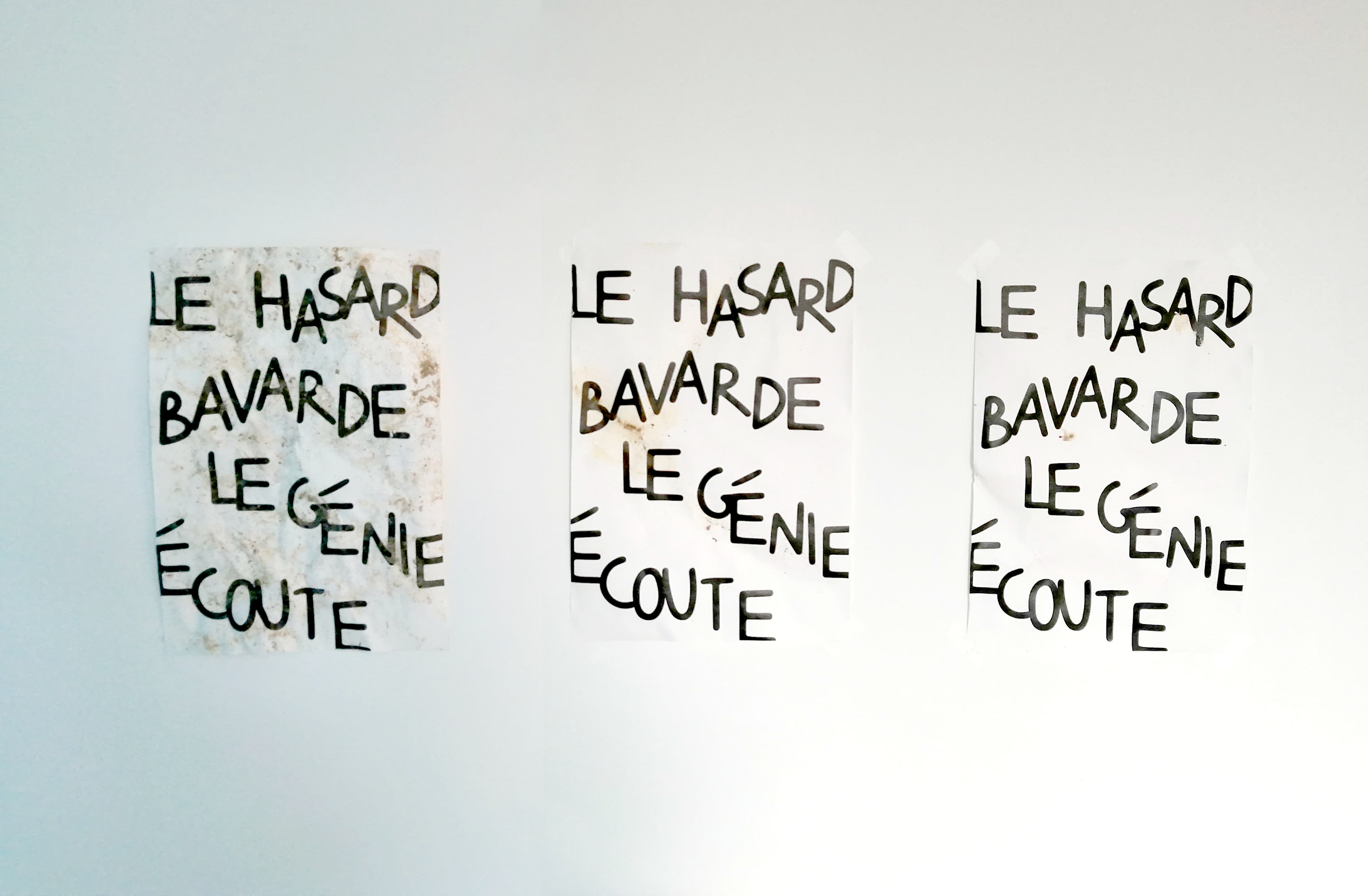 Pour ce projet, mon intention est de lier le hasard au vivant, qui est le thème principal de mon mémoire de DSAA. Dans le cadre de ce projet, le «vivant» se restreint aux 4 éléments. J’ai voulu voir comment chacun des éléments eau, feu, terre, air pouvait intervenir de façon hasardeuse avec un support imprimé. Quelles étaient les modifications apportées par l’élément sur le support.