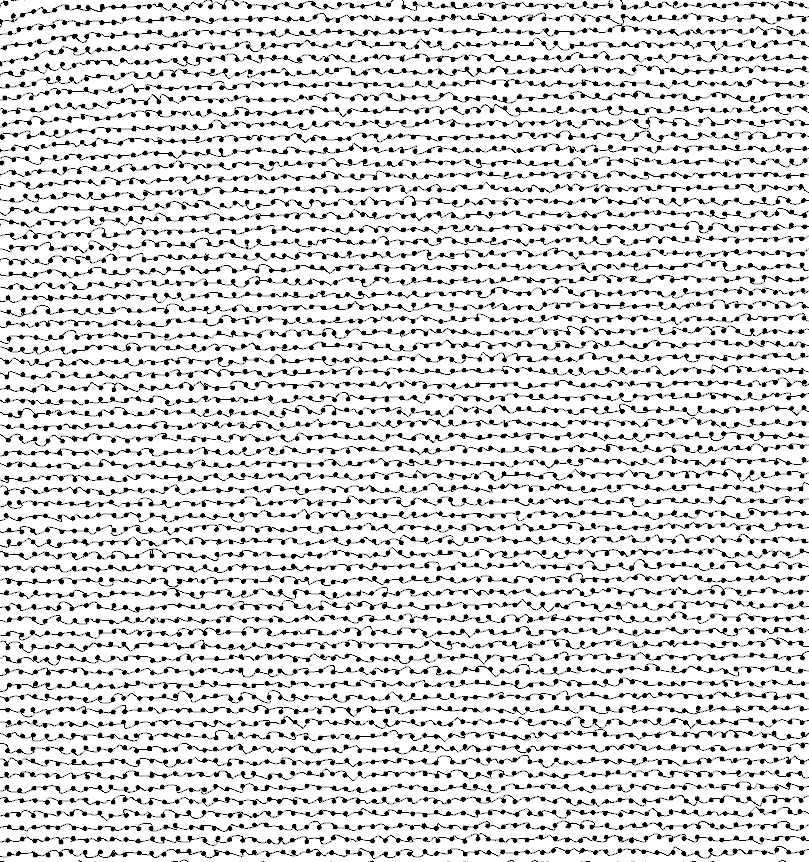 J'ai obtenu le résultat escompté (Muti : expliquer cette phrase qui arrive brutalement) et j'ai donc ajouté un bruitage de tissu qui se déchire pour un côté plus immersif. Le code dessine des lignes balisées de point noirs pouvant évoluer en fonction de comment est placé le curseur de la souris. Il simule le déchirement du tissu, c'est pour cela que ce programme processing correspond en tout point avec la thématique de mon projet de pratique plastique. Je voulais représenter l’altération suite au passage de quelque chose. Chaque fois que le programme est ouvert, l'altération n'est jamais la même. Nous sommes acteur de l'altération et nous pouvons décider de comment va s'étioler le tissage.