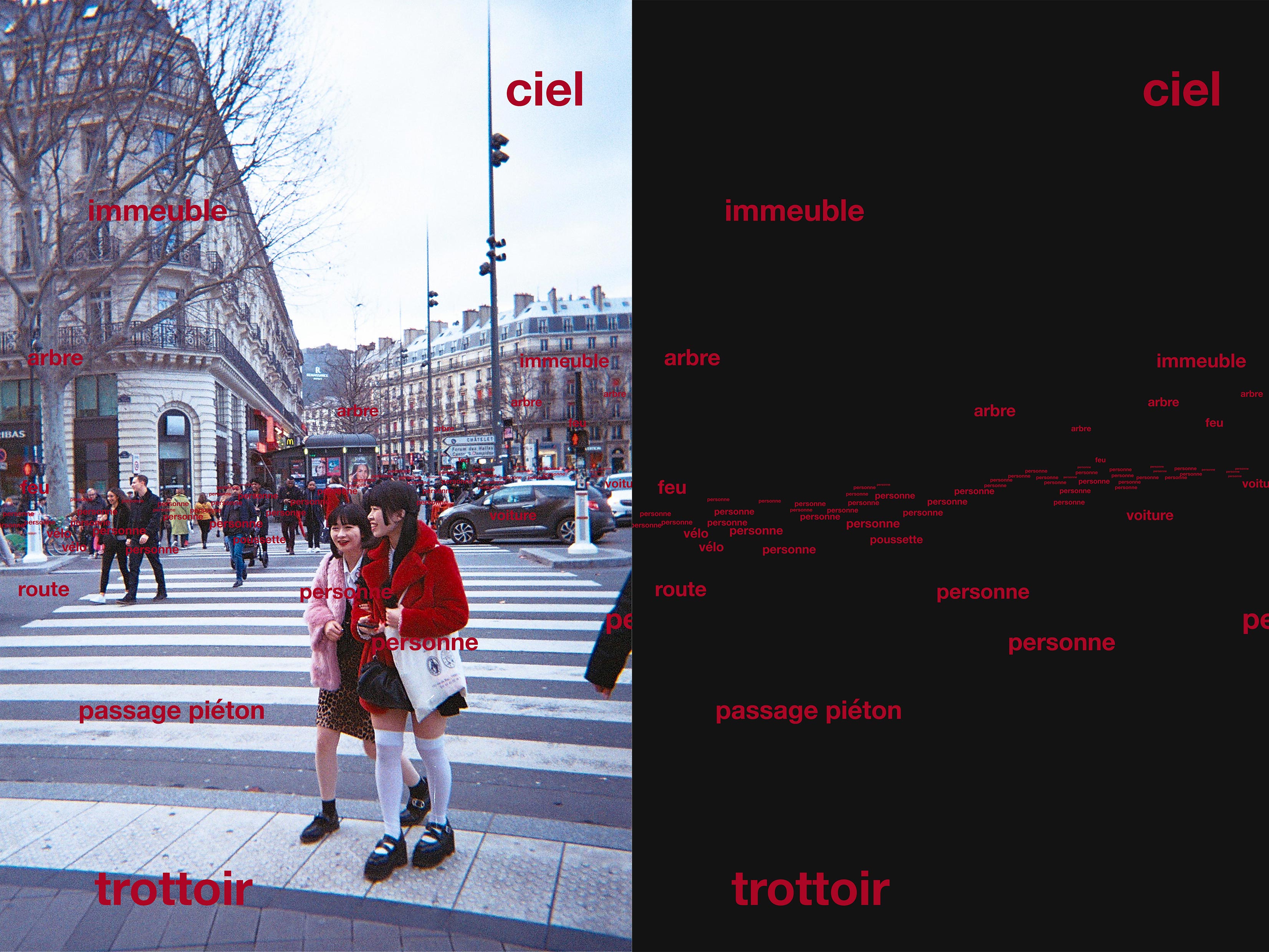 Pour la seconde partie de mon projet j’ai également voulu faire intervenir le hasard dans le texte et la composition. J’ai réalisé une série de cinq photographies avec un appareil jetable pour exclure toute possibilité de réglages. J’ai utilisé la dynamique de foule comme point de départ photographique car son esssence est liée au hasard : il s’agit d’une multitude de personnes rassemblées en un point. Mon but est d’expérimenter les propriétés formelles de composition en convertissant la foule en signifiants typographiques. J’ai trouvé intéressant d’organiser la désorganisation de la foule et d’en étudier sa variation à travers les différentes compositions créées au hasard de ces images.