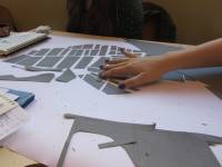 Le but de noter travail étant de retranscrire visuellement les texture associée à chaque odeur, nous avons choisit de réaliser de petit tampons à l'aide des éléments récupérés pendant notre smellwalk.Après avoir défini les textures des odeurs relevées, nous avons pris le parti de crée une carte où chacun pourrait à son tour choisir quelle texture attribuer à quelle odeur et à quel endroit la placer. Nous avons donc laissé notre carte vierge et indiquer via un quadrillage la localisation de certaines odeurs, le but étant de laisser le public placer lui même les odeurs sur la carte.